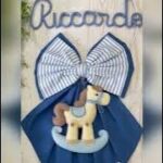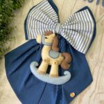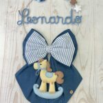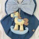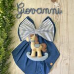 Dal fiocco pende un tenero cavalluccio a dondolo in pannolenci tridimensionale, simbolo di dolcezza e infanzia, che completa la composizione con un tocco artigianale.