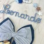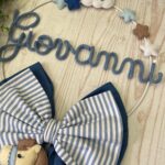 Un cerchio in metallo bianco con decori in pannolenci incornicia il nome del bimbo in tricotin azzurro, rendendo questo fiocco unico e personalizzabile.