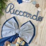 Il fiocco, in cotone azzurro, è arricchito da un secondo fiocco più piccolo a righe panna e azzurro, per un effetto elegante e armonioso.