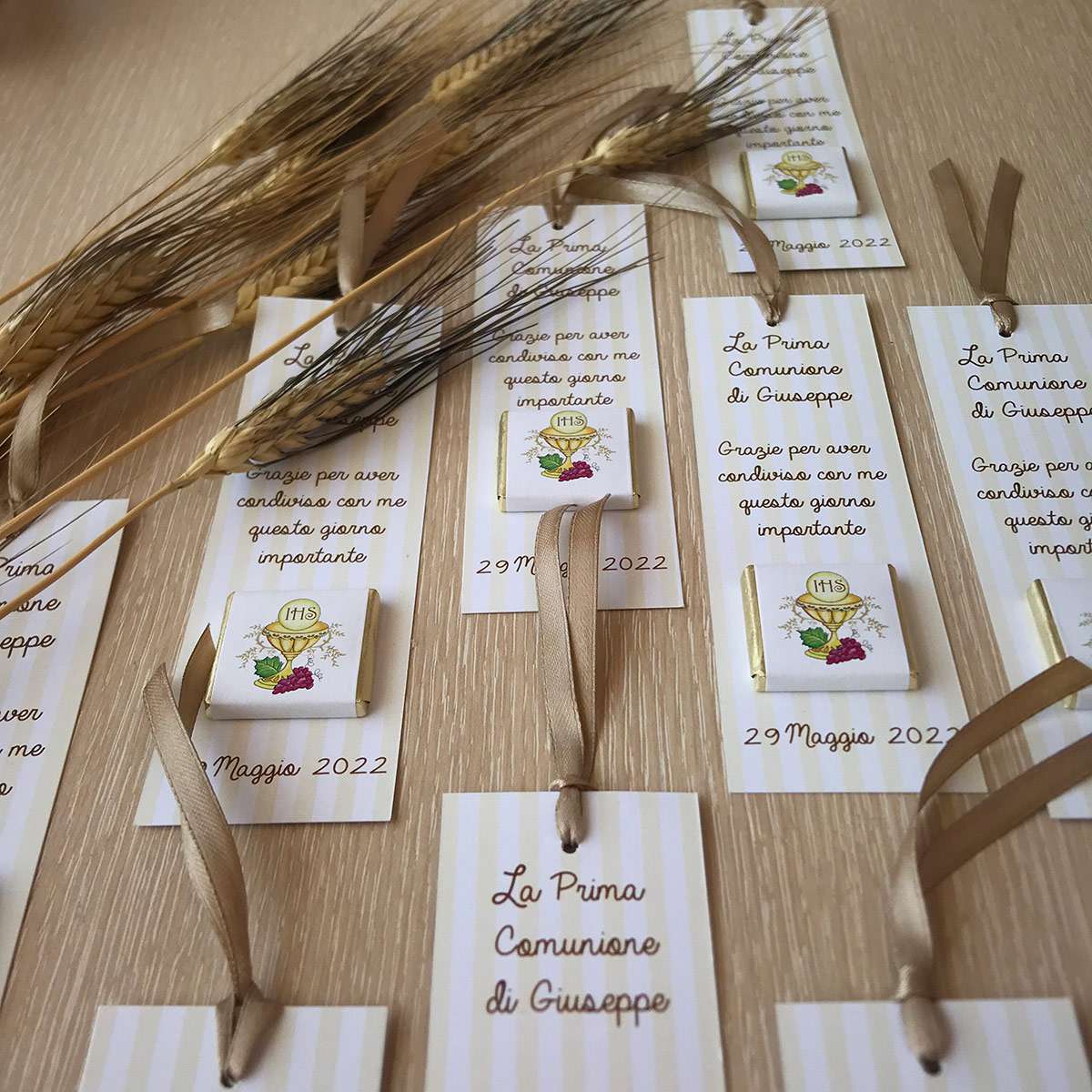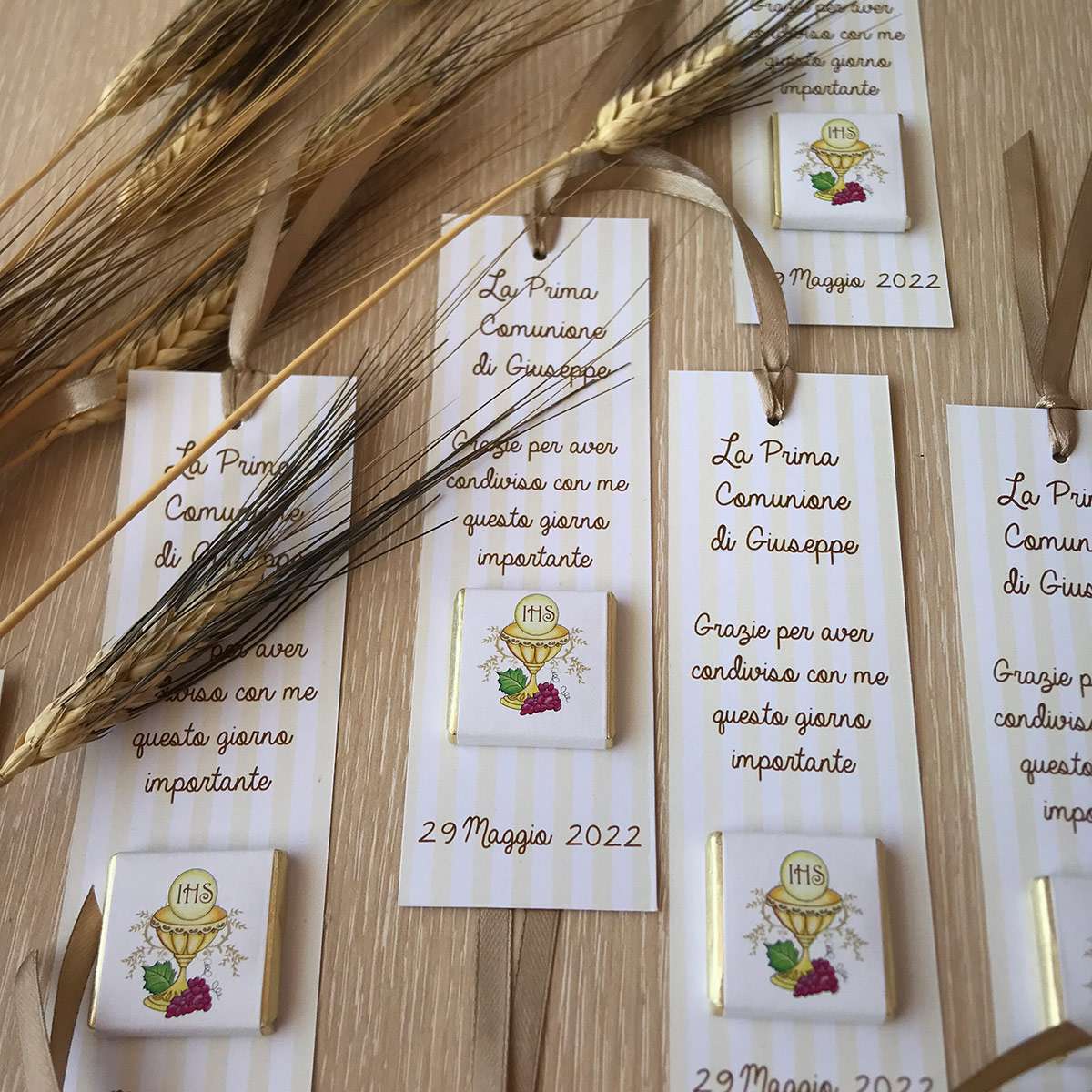 – Un cioccolatino (al latte o fondente) con nome, confezionato con nastro di raso 1,6cm.