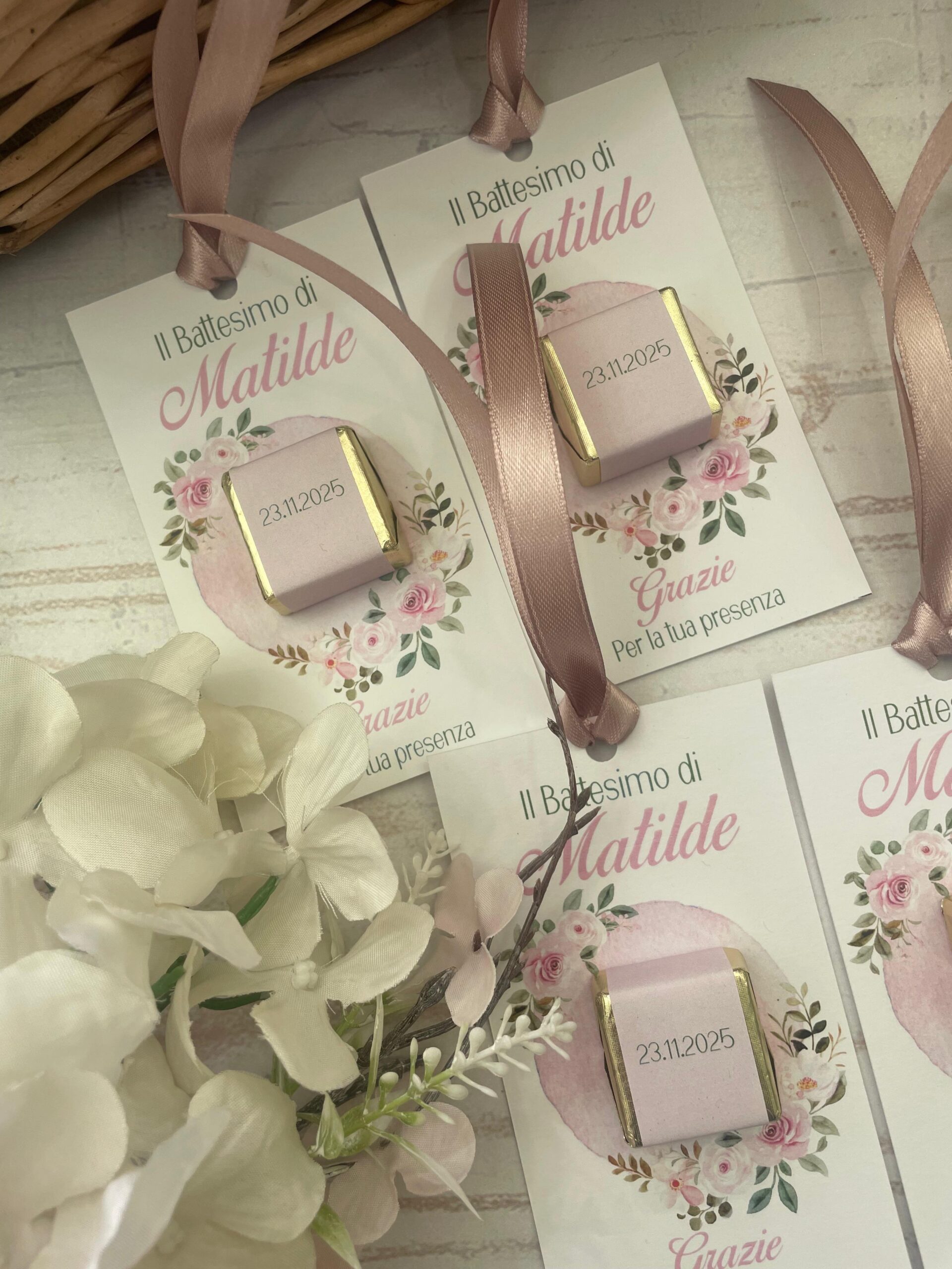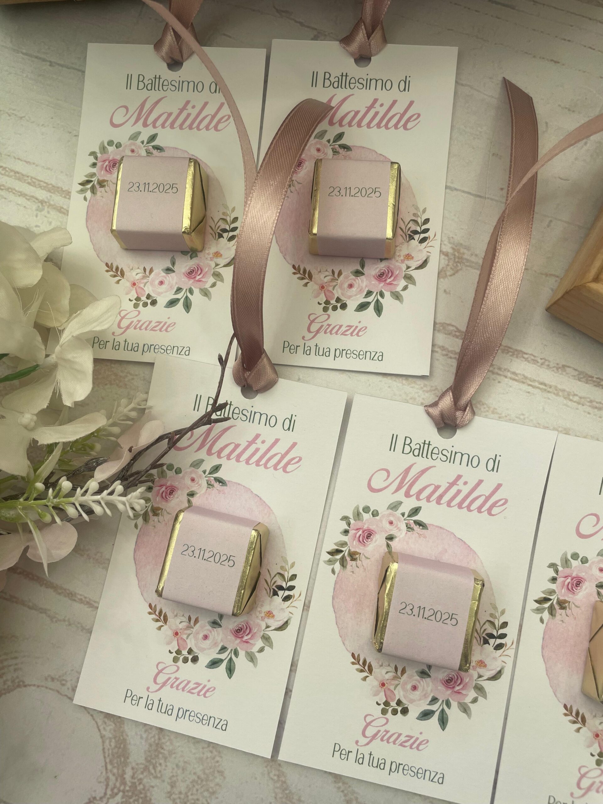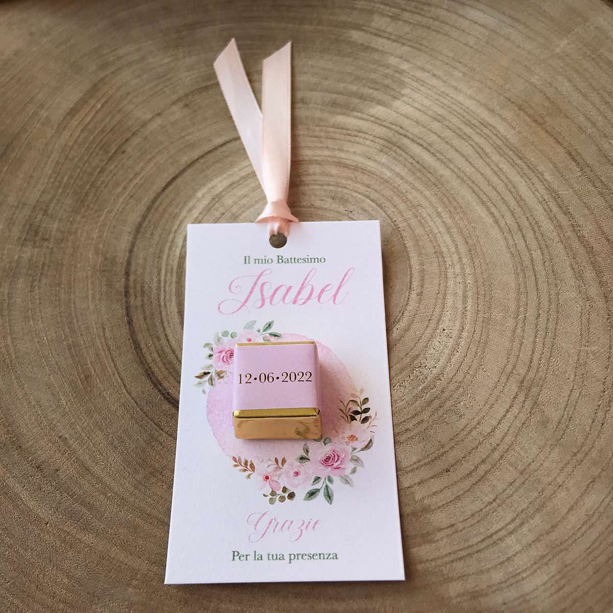 – Un cremino con nome, confezionato con nastro di raso 1,6cm.