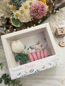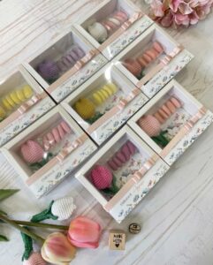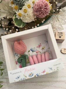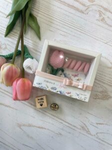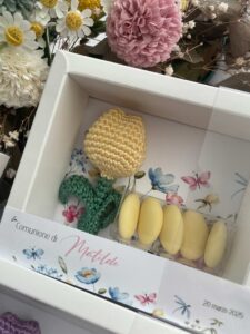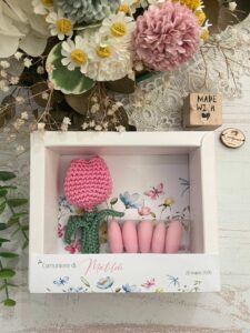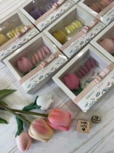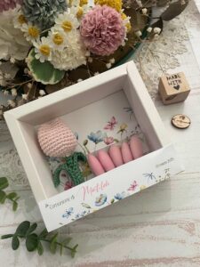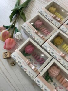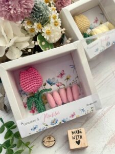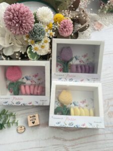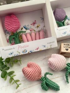 Il box arriverà già confezionato e pronto da donare, completo di tulipano amigurumi profumato e scatolina di confetti sigillata.