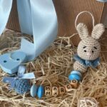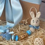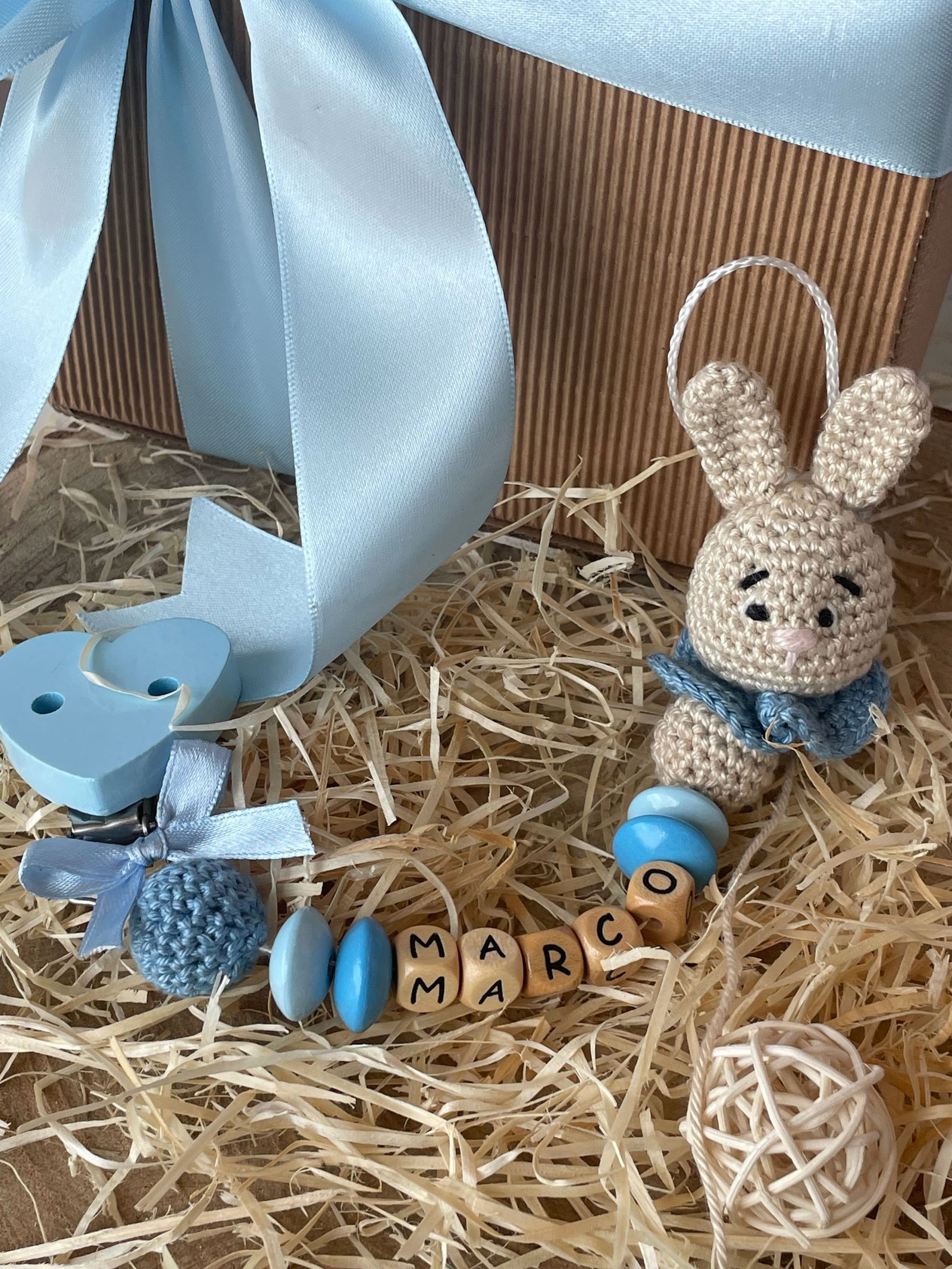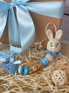 Catenella porta ciuccio con il nome della bimba/bimbo (personalizzabile) scritto su dei dadini in legno, con un piccolo coniglietto in amigurumi alla base.