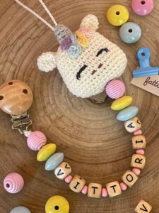 Catenella porta ciuccio con il nome della bimba/bimbo (personalizzabile) scritto su dei dadini in legno, con un piccolo unicorno in amigurumi alla base.