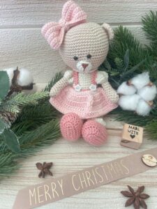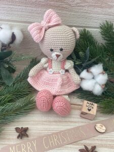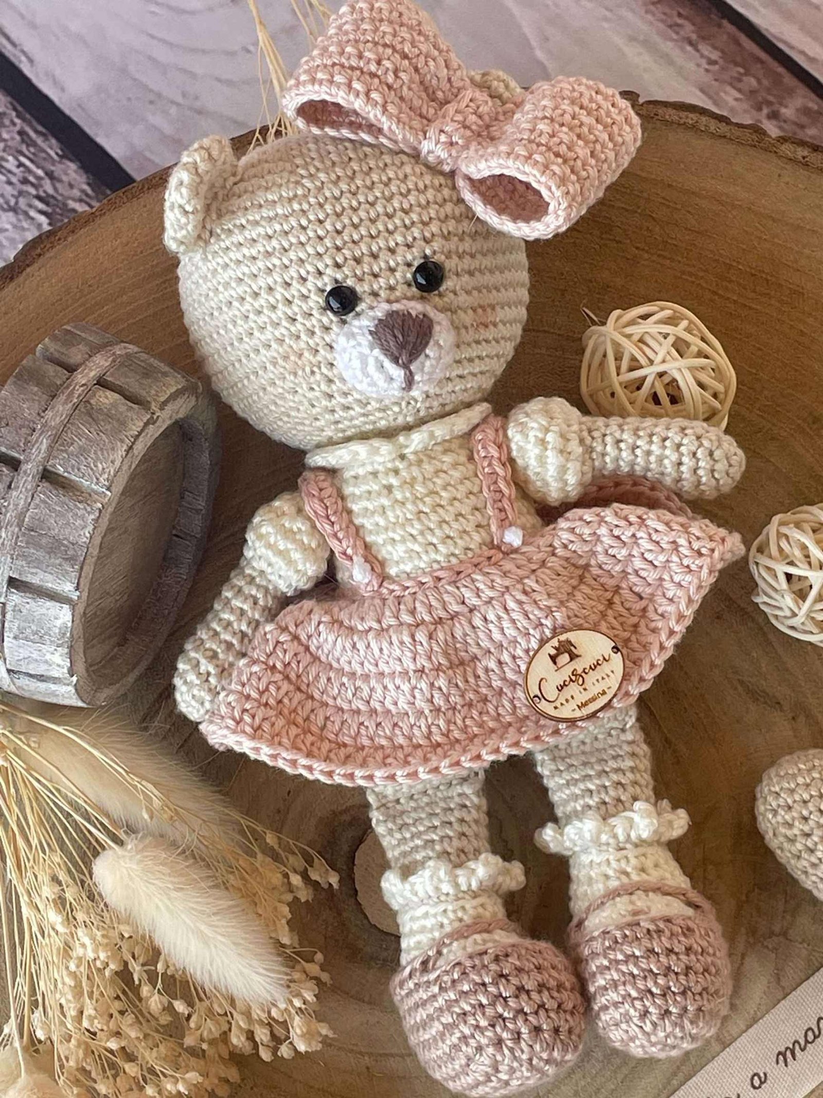 Una tenera orsetta, che indossa un abito rosa, realizzata in cotone con la tecnica dell’amigurumi.
