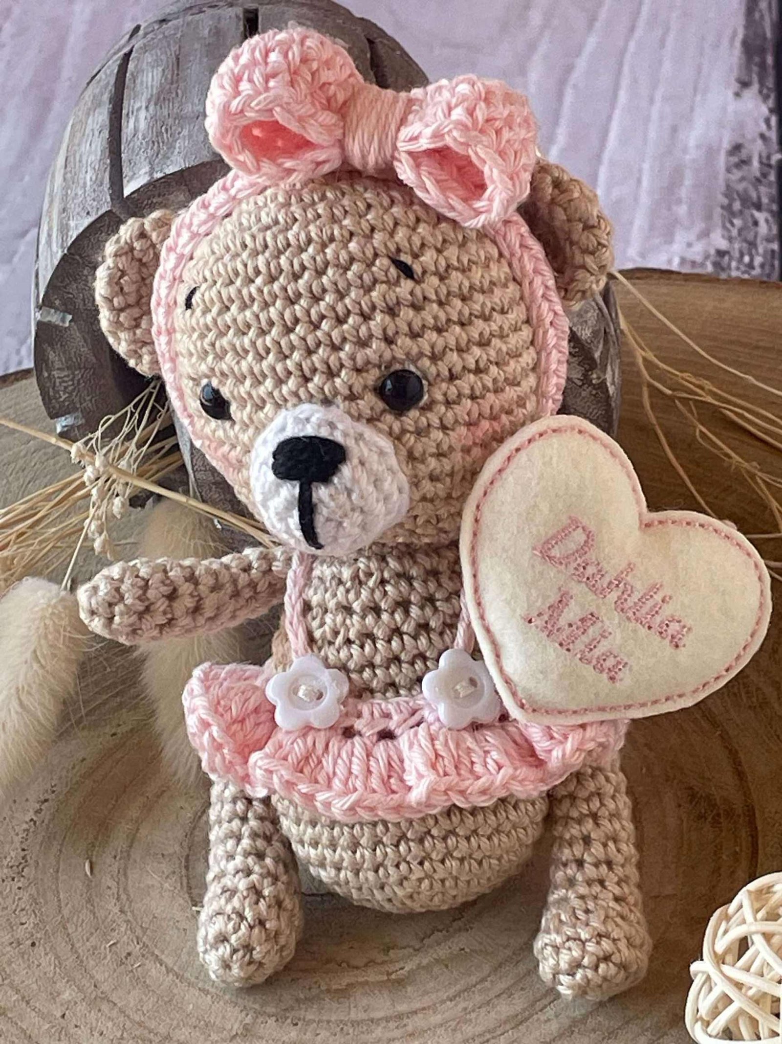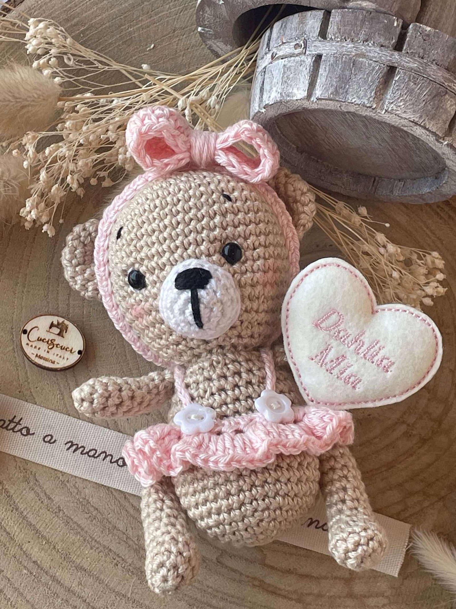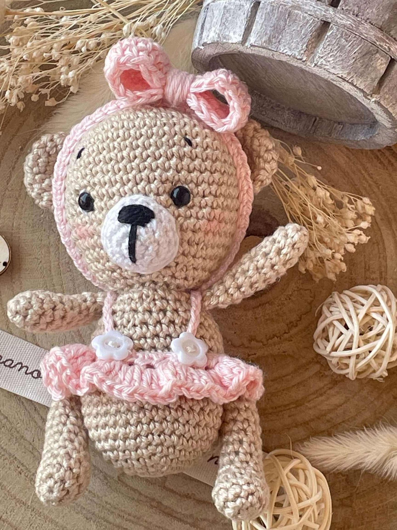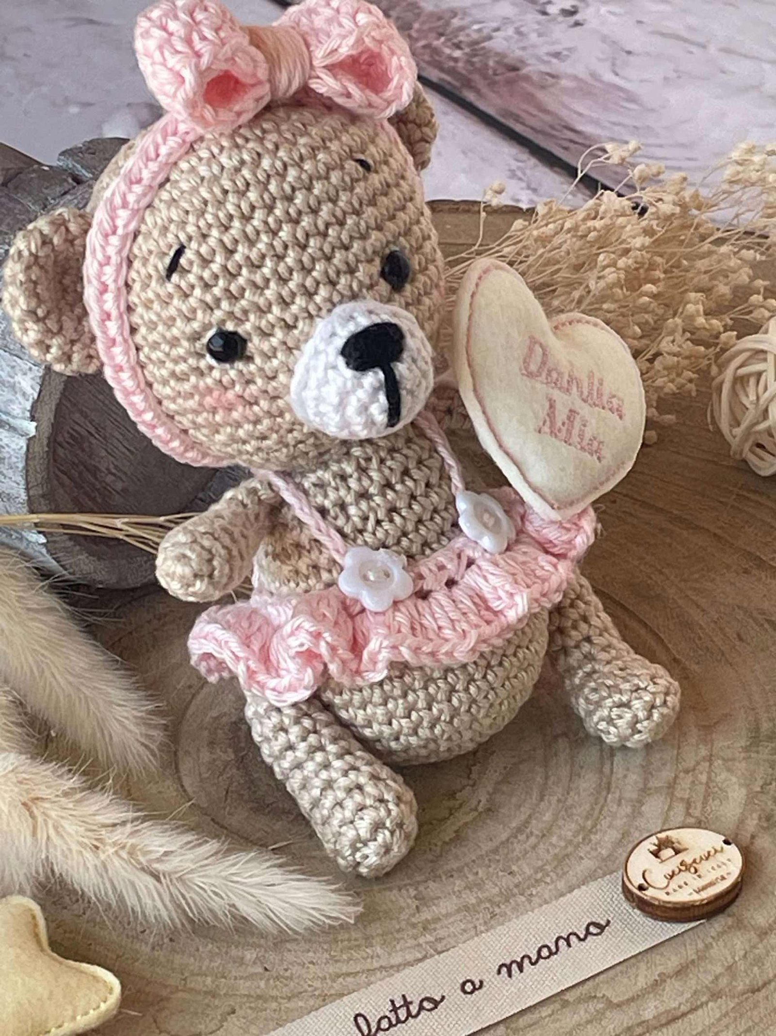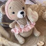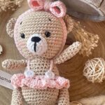 Una tenera orsetta, che indossa un tutù rosa, realizzata in cotone con la tecnica dell’amigurumi.