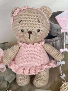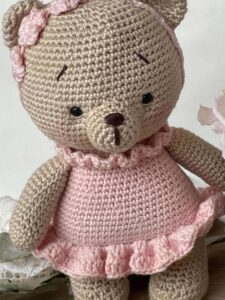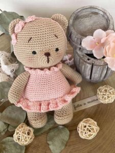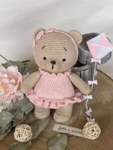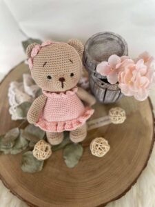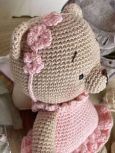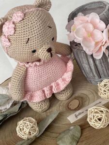 Orsetta, realizzata in cotone, che indossa un vestito rosa e un cerchietto con tre fiorellini.