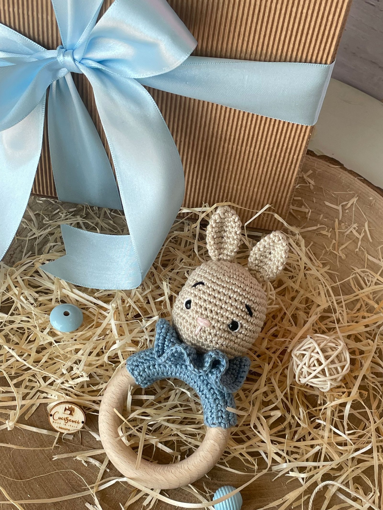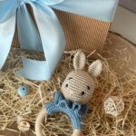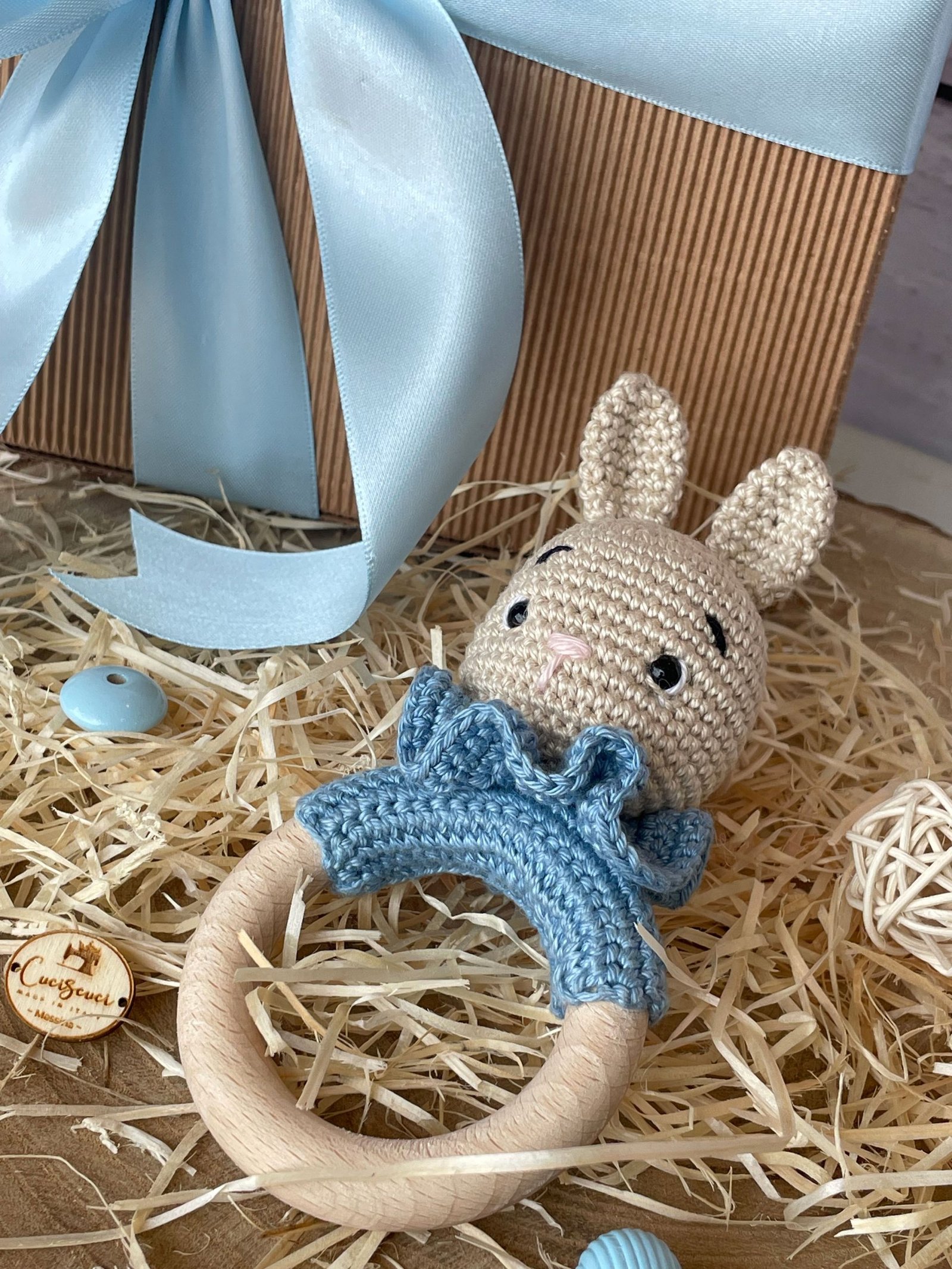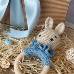 Sonaglio a forma di coniglio realizzato con la tecnica amigurumi e anello di dentizione in legno.