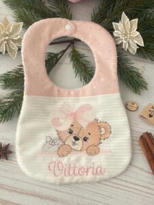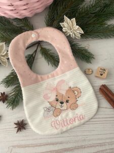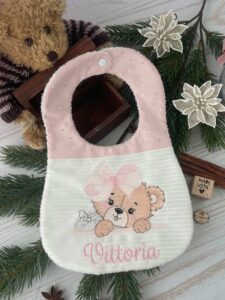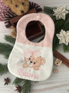 Bavaglino realizzato interamente a mano dalla nostra sartoria, con nome personalizzato e il ricamo di un’orsetta.