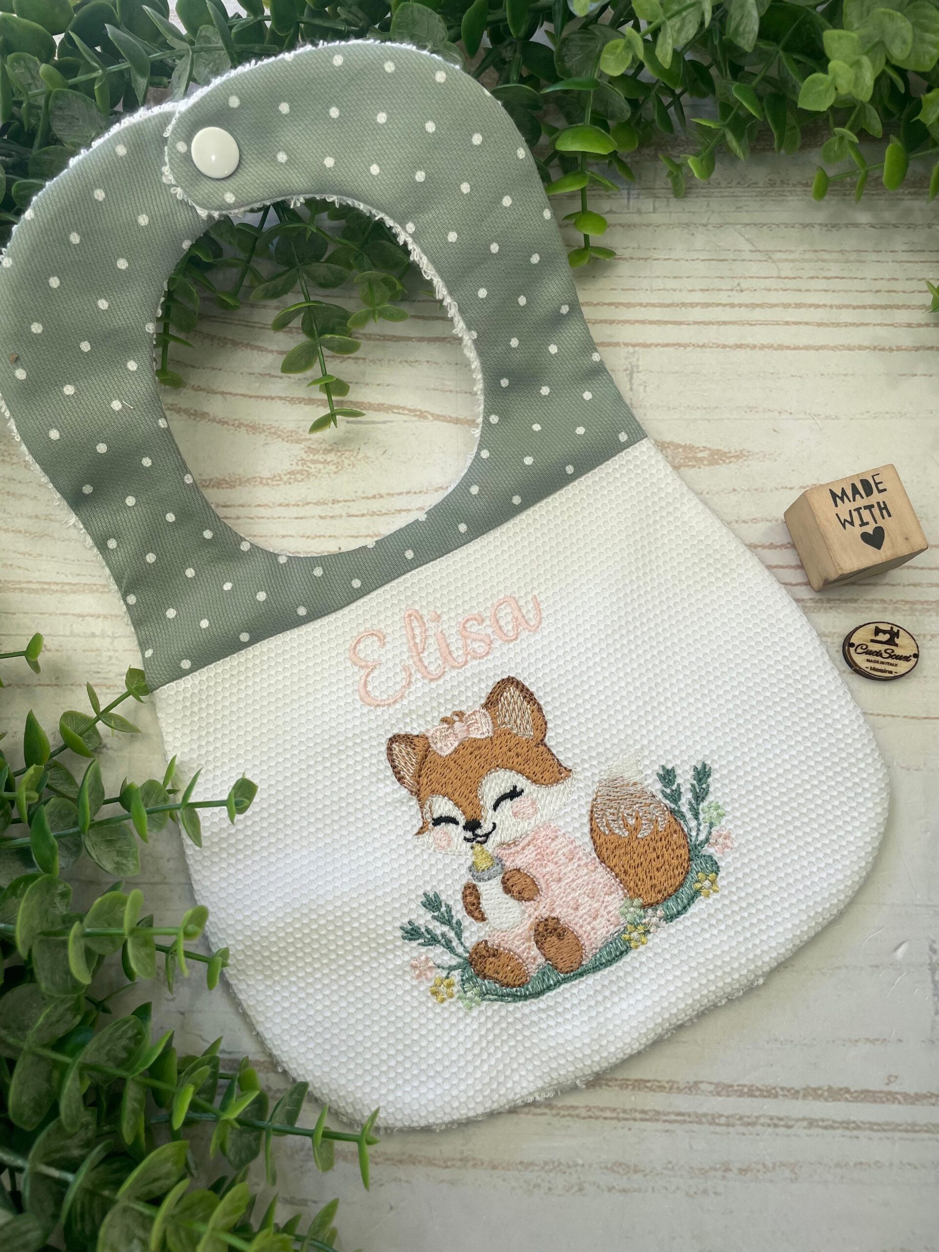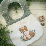 Un bavaglino artigianale realizzato interamente a mano nella nostra sartoria, con base in rigatino di cotone bianco e parte superiore in verde a pois bianchi. Il ricamo della volpina, insieme al nome personalizzato, rende questo accessorio unico e pensato per accompagnare i più piccoli con dolcezza e stile. La chiusura con bottone metallico garantisce praticità e sicurezza durante l’uso.