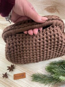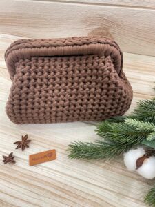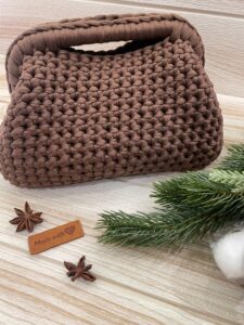 Clutch artigianale in fettuccia color caffè lavorata con tecnica crochet. Un accessorio raffinato e versatile. La clutch bag è perfetta sia per outfit eleganti che casual, aggiungendo un tocco di originalità ai tuoi look.