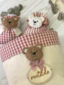 Realizzato in cotone tinto filo, interamente a mano, nei toni del rosa antico e del panna, rifinito con bordo a quadretti, il cestino è impreziosito da una targhetta in legno personalizzata con il nome della bambina e da un orsetto in tessuto bouclè.