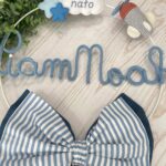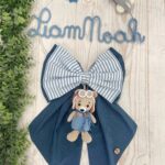 Il fiocco, in cotone azzurro, è arricchito da un secondo fiocco più piccolo a righe panna e azzurro, per un effetto armonioso e raffinato.