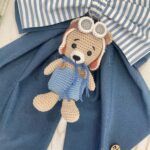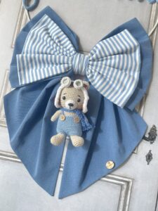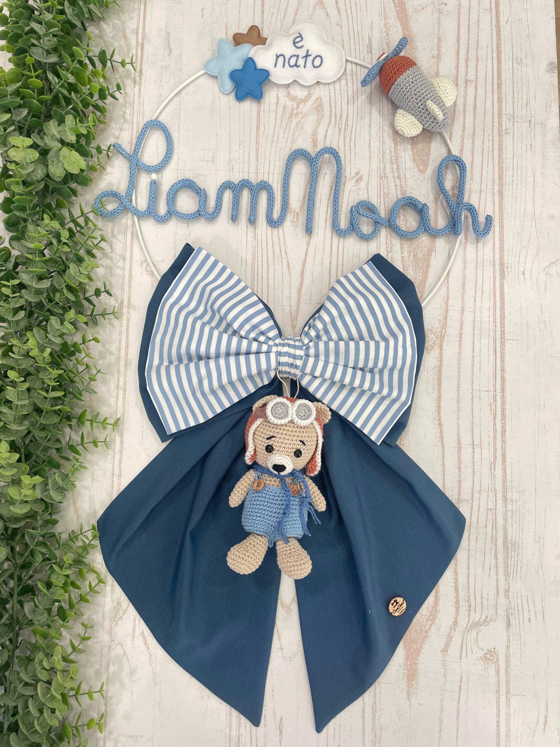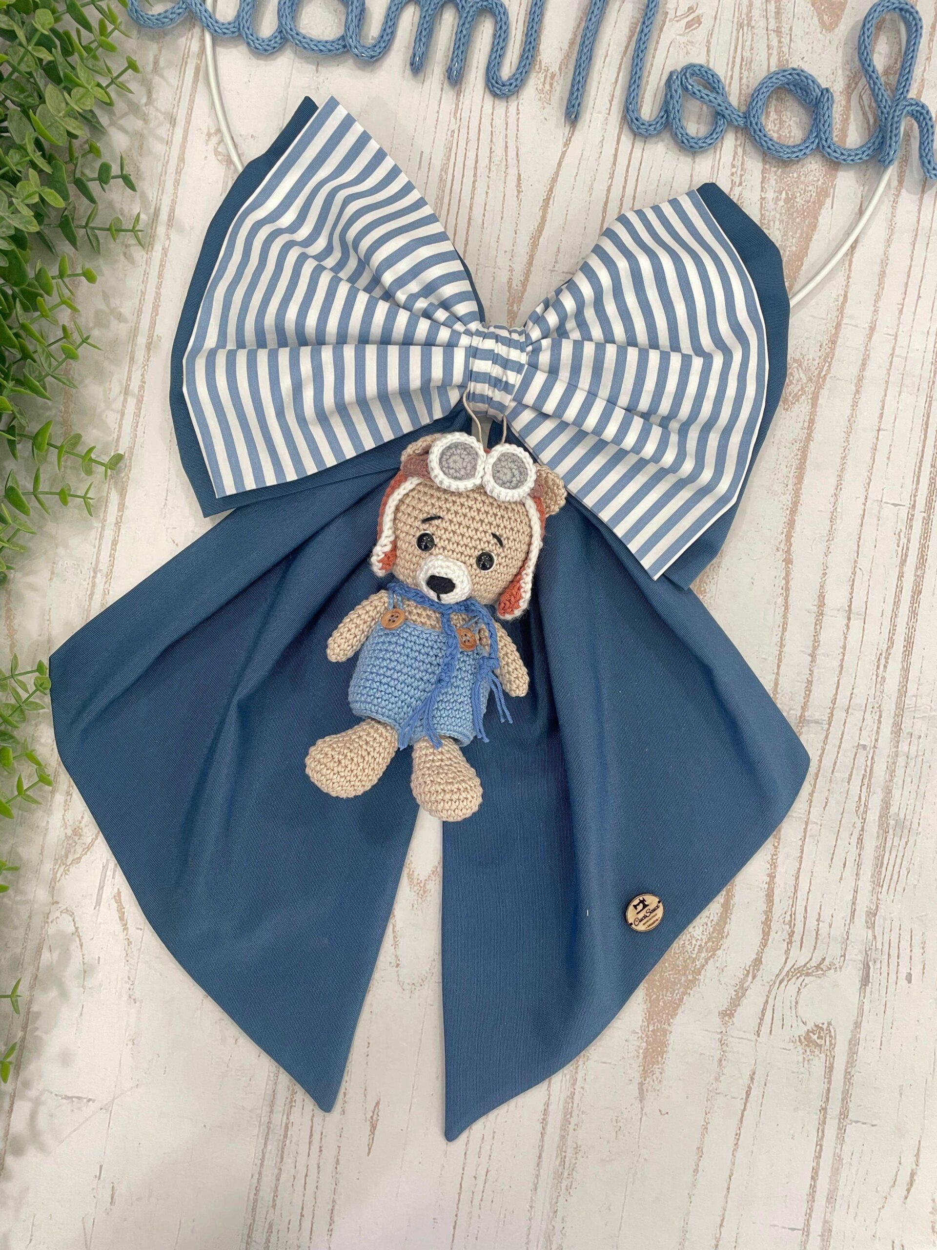 Dal fiocco pende un tenero orsetto aviatore tridimensionale, realizzato con la tecnica amigurumi, che aggiunge un tocco originale e dolcemente avventuroso.