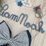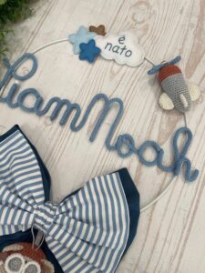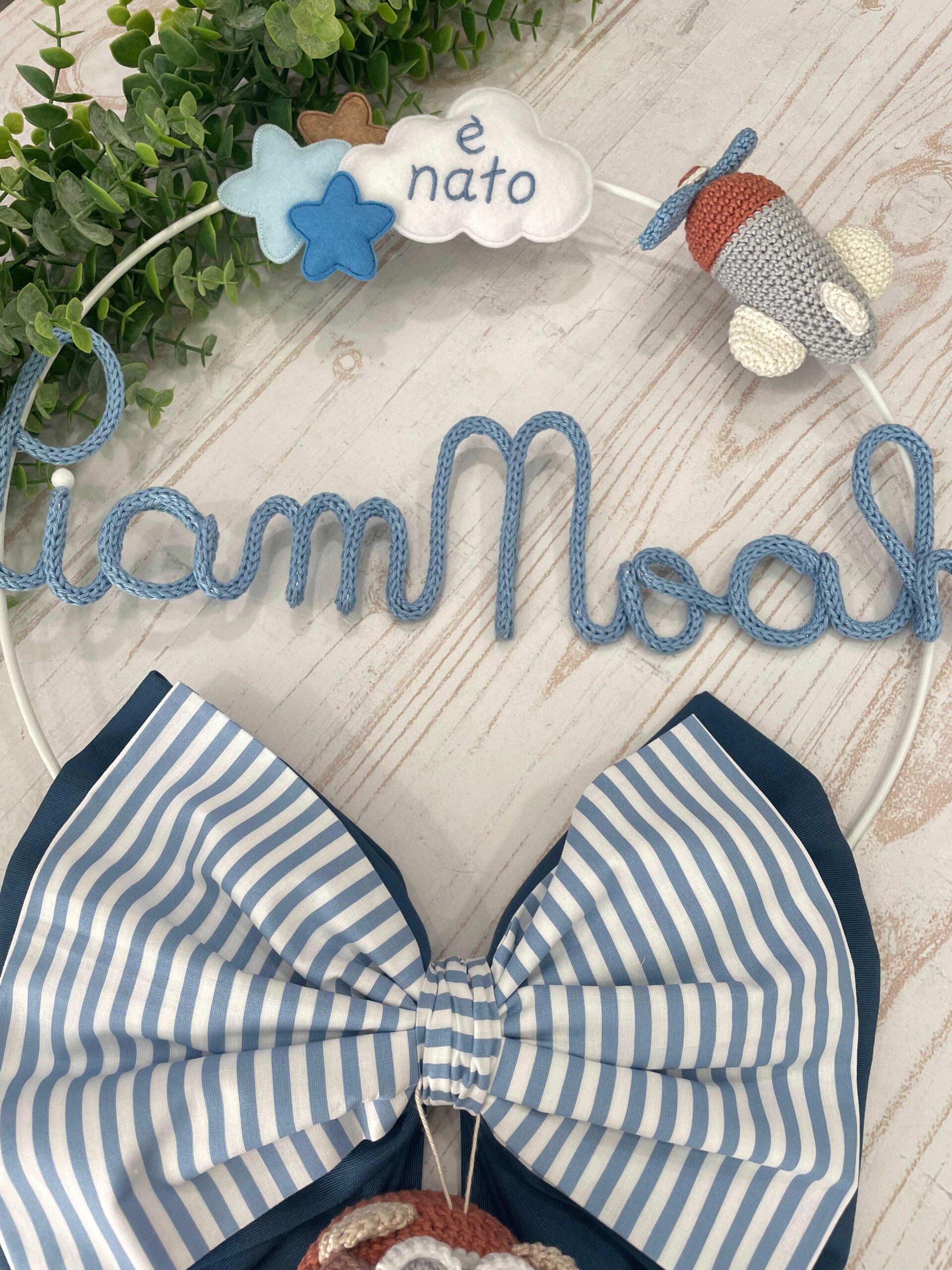 Un cerchio in metallo bianco impreziosito da decori in pannolenci e dettagli in crochet incornicia il nome del bimbo in tricotin azzurro, rendendo il fiocco unico e personalizzabile.