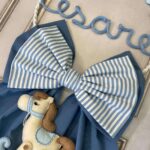 Il fiocco, in cotone azzurro, presenta un secondo fiocco più piccolo in fantasia a righe panna e azzurro, applicato su quello principale per un effetto delicato e armonioso.