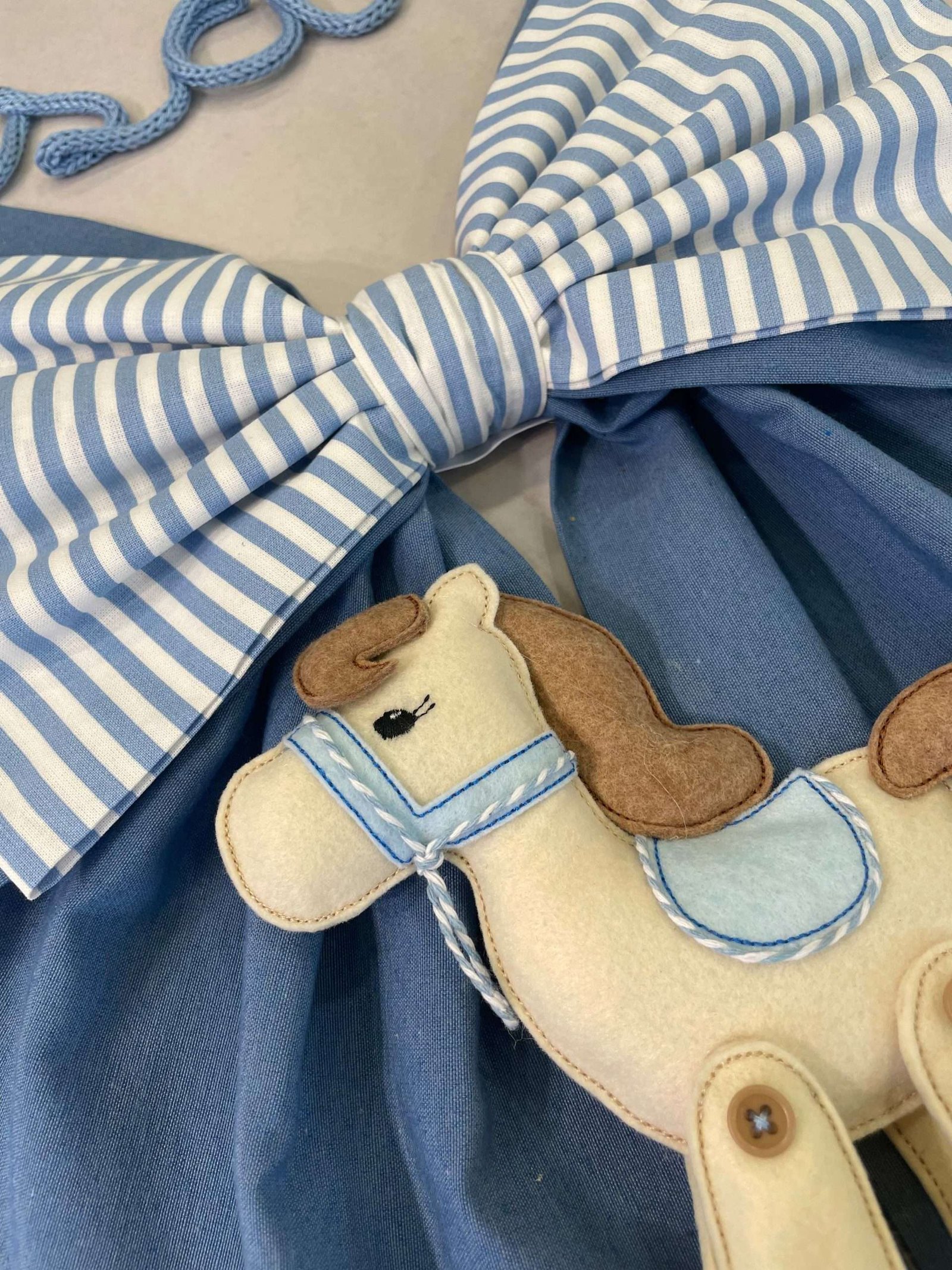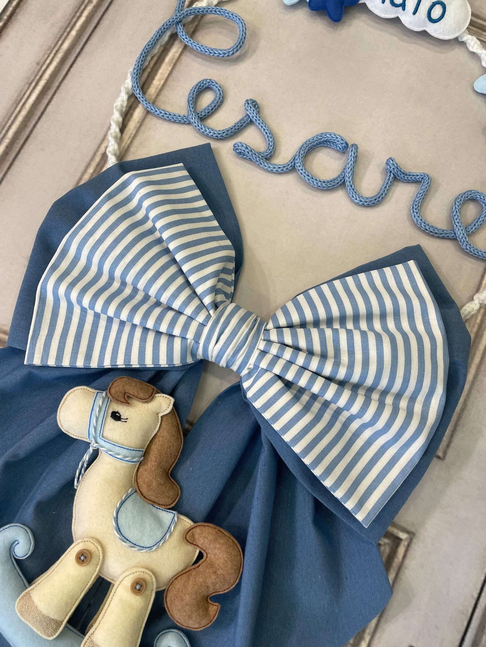 Il fiocco, in cotone azzurro, presenta un secondo fiocco più piccolo in fantasia a righe panna e azzurro, applicato su quello principale per un effetto delicato e armonioso.