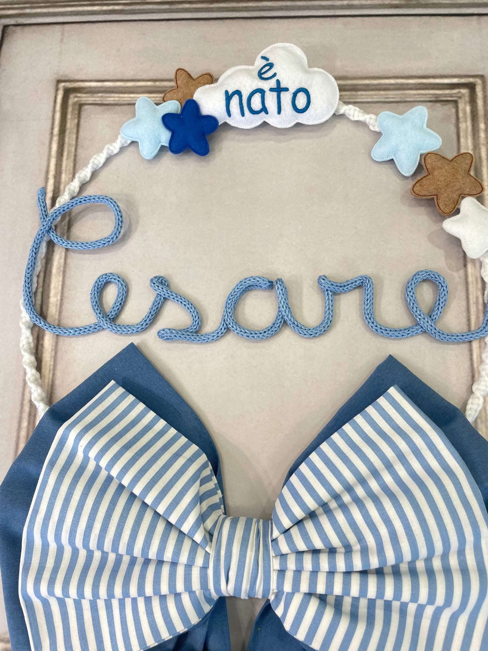 Un cerchio in metallo bianco rivestito in macramè, decorato con elementi in pannolenci, incornicia il nome del bimbo in tricotin azzurro (personalizzabile).