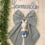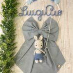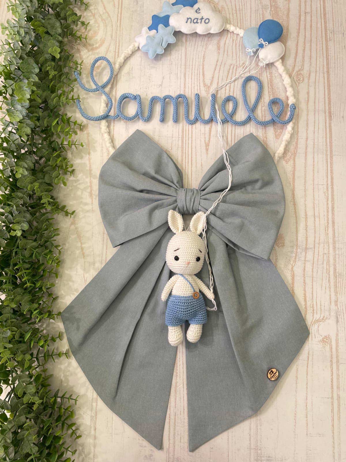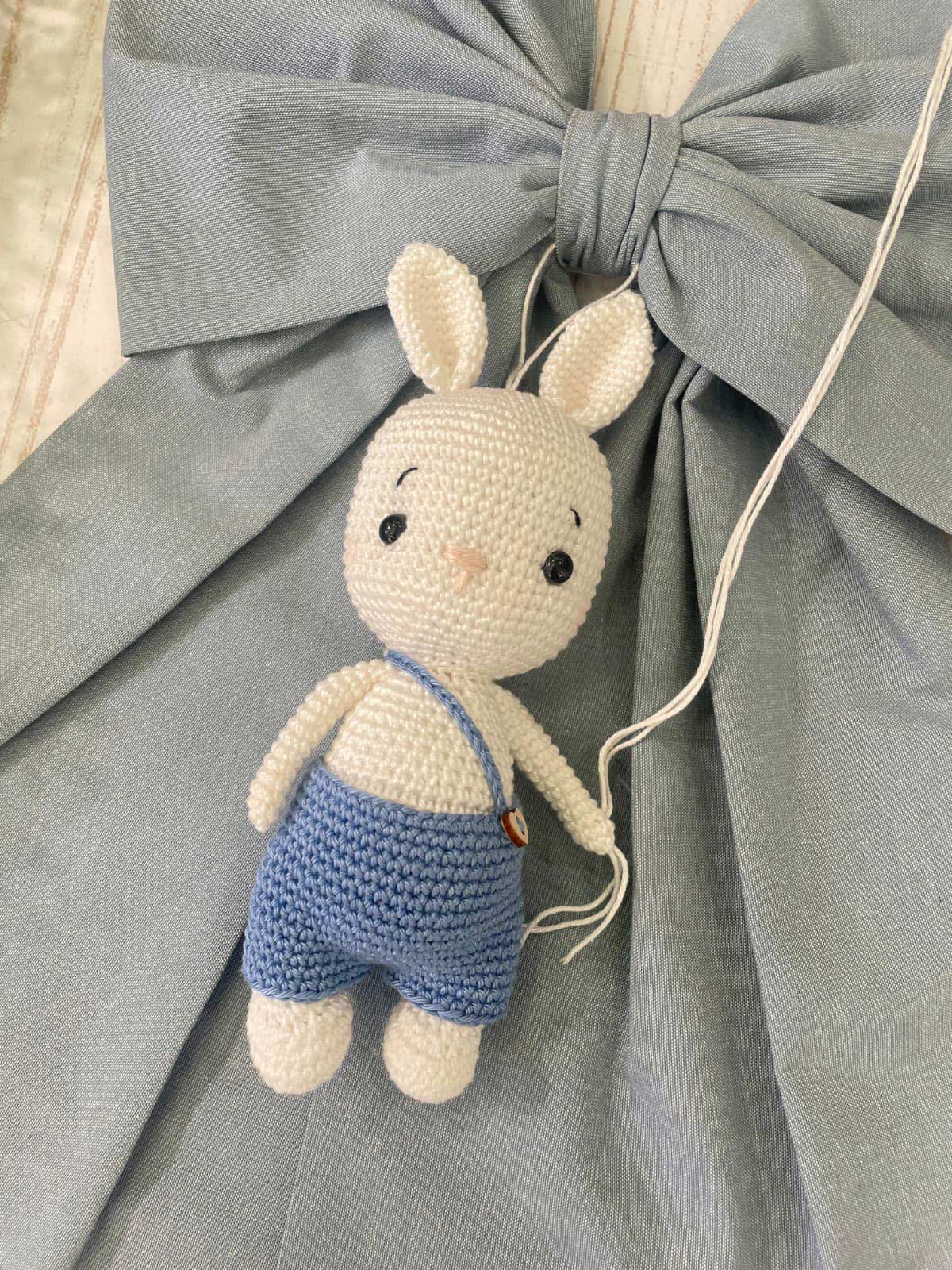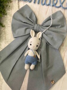 Dal fiocco pende un tenero coniglietto realizzato a mano con la tecnica dell’amigurumi, simbolo di dolcezza e protezione.