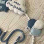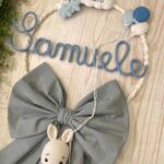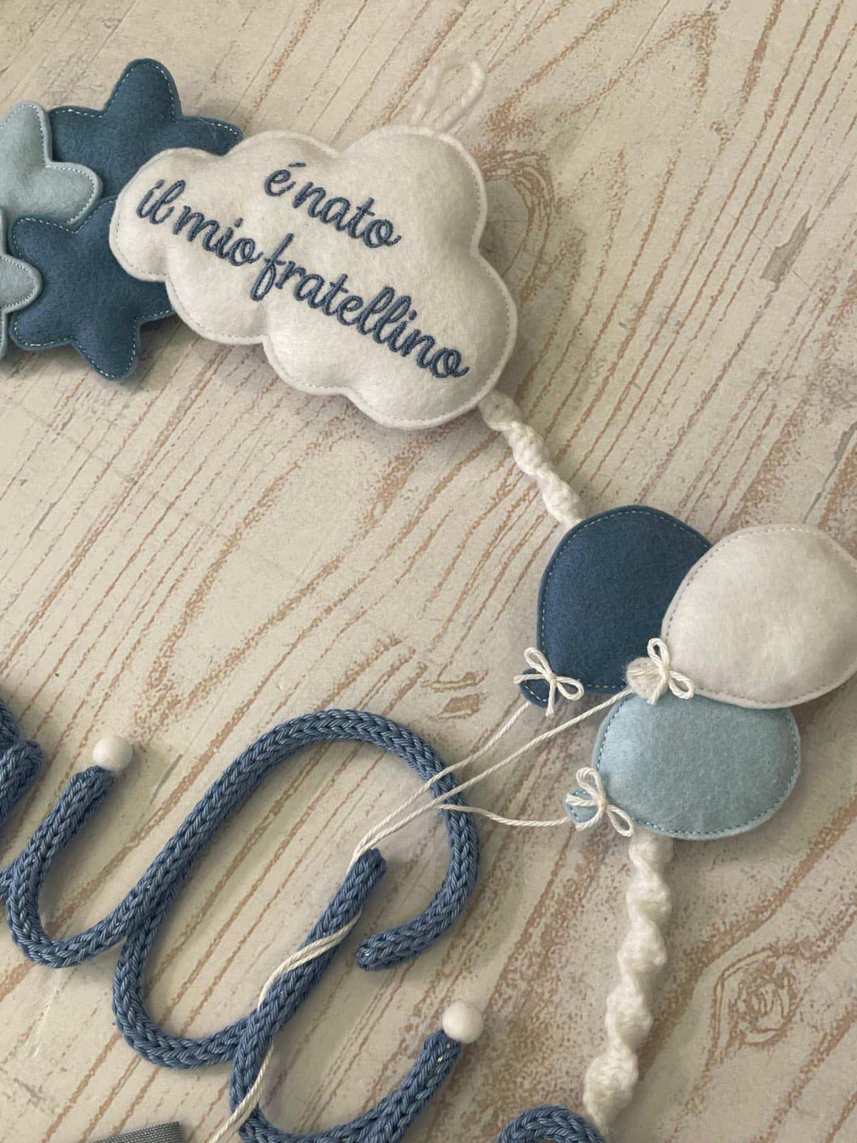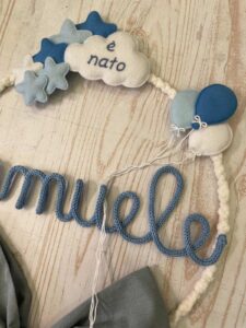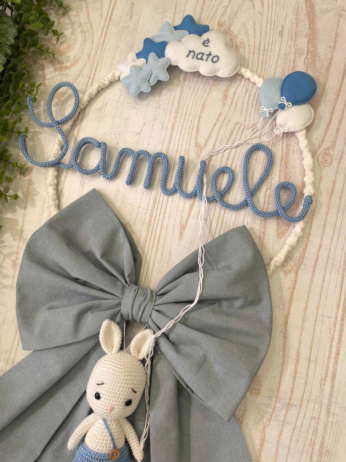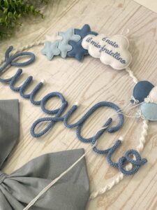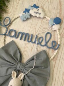 Al centro spicca il nome del bimbo in tricotin celeste, elemento che rende il fiocco unico e speciale.