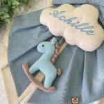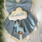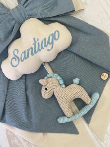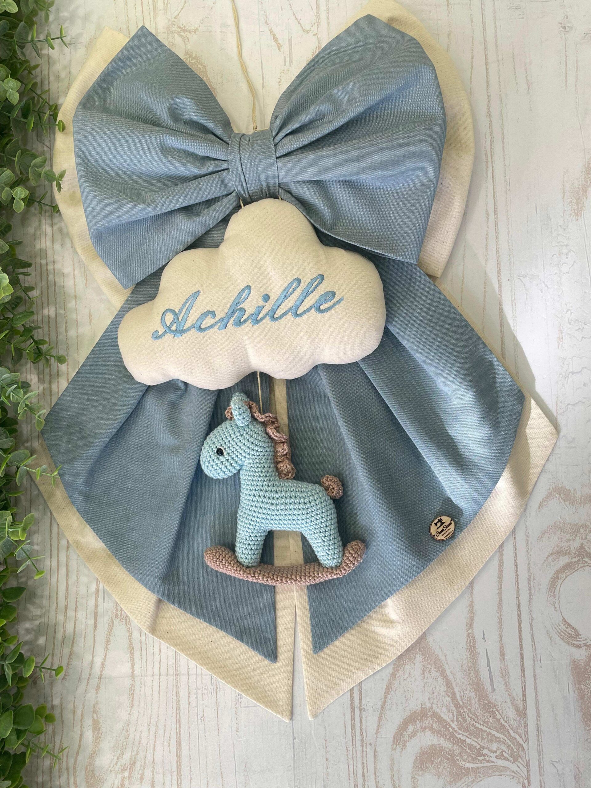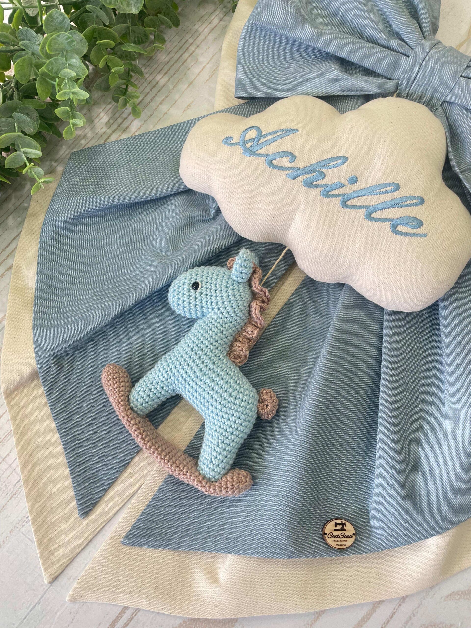 Sul fiocco spicca una nuvola in cotone con il nome del bimbo ricamato (personalizzabile), da cui pende un cavallino a dondolo realizzato all’uncinetto con la tecnica amigurumi.