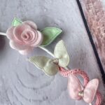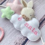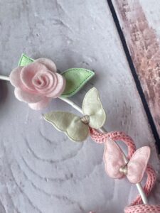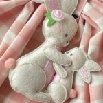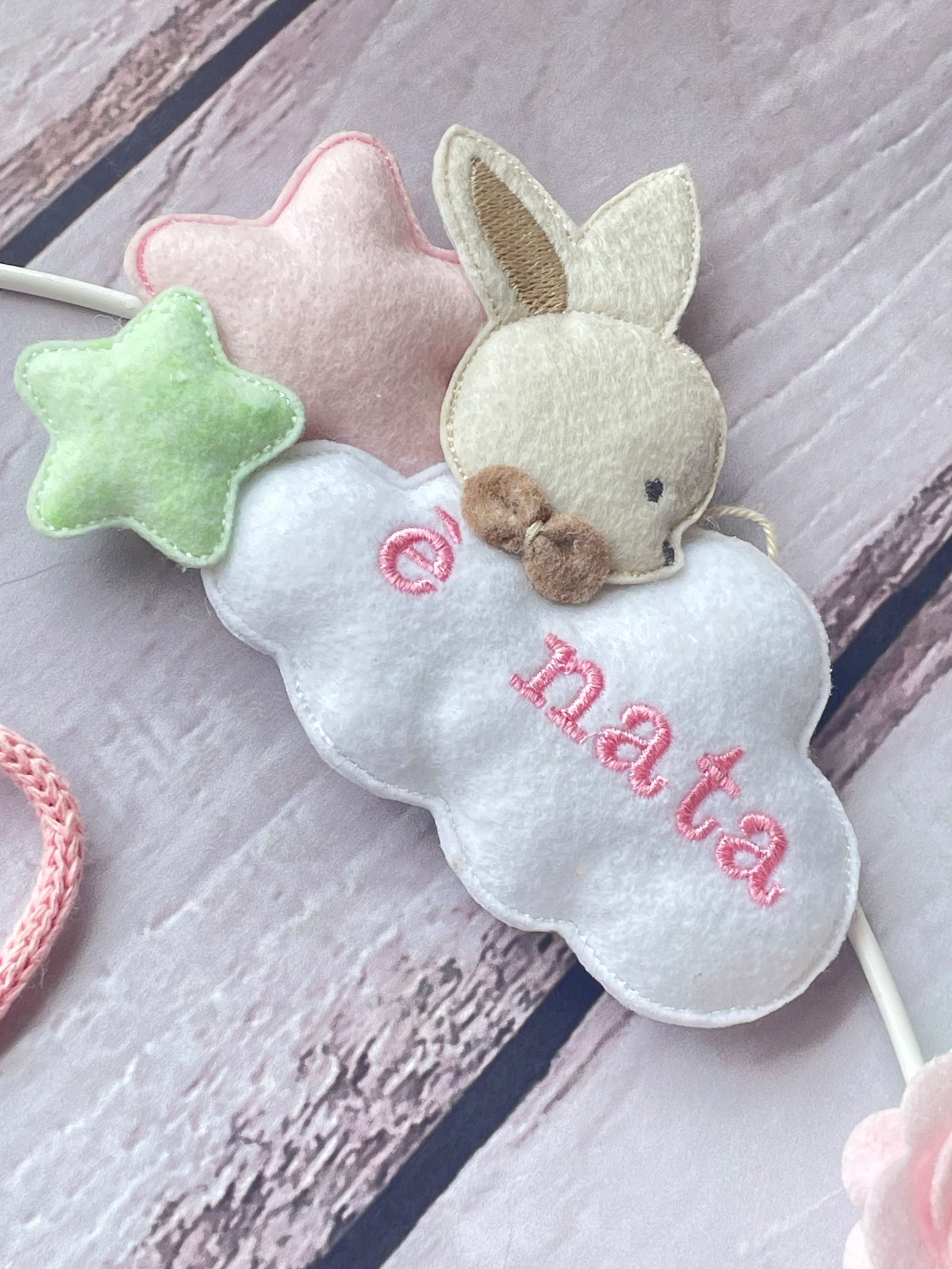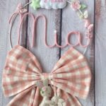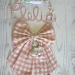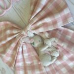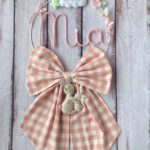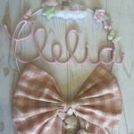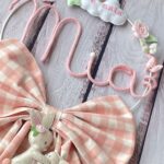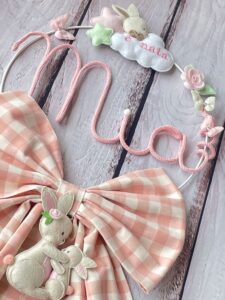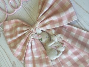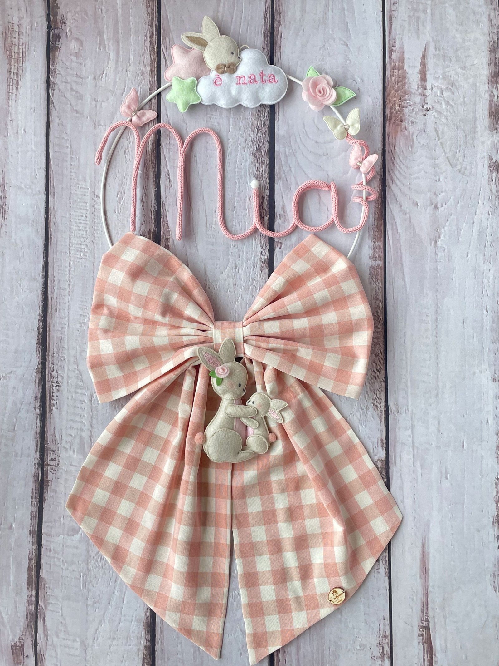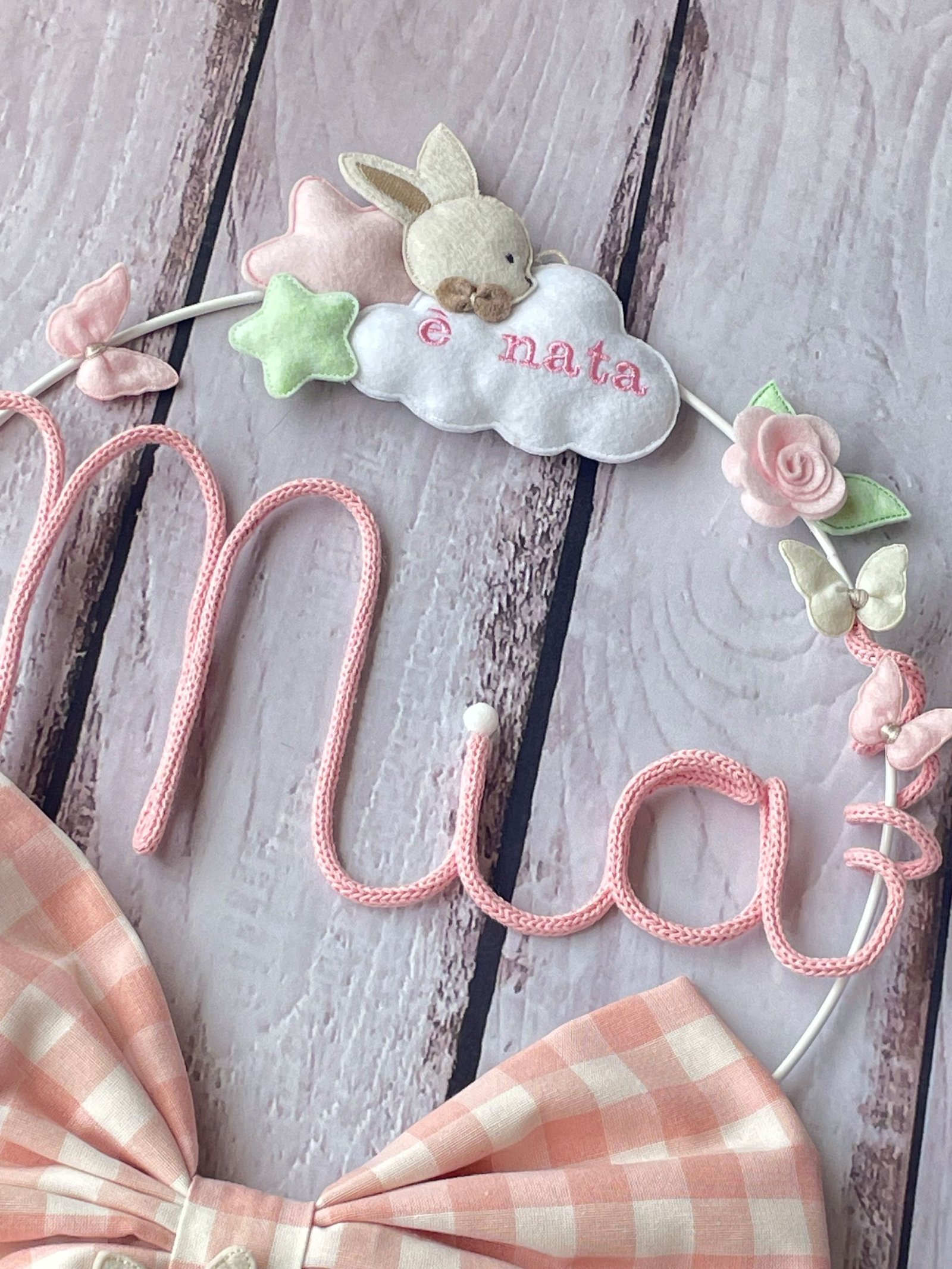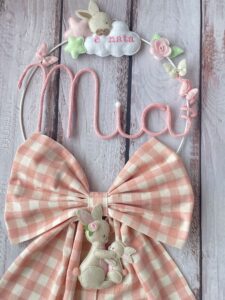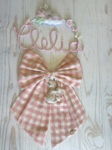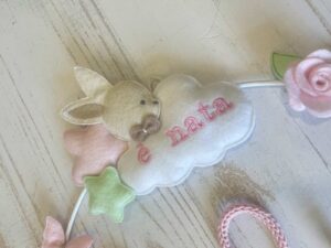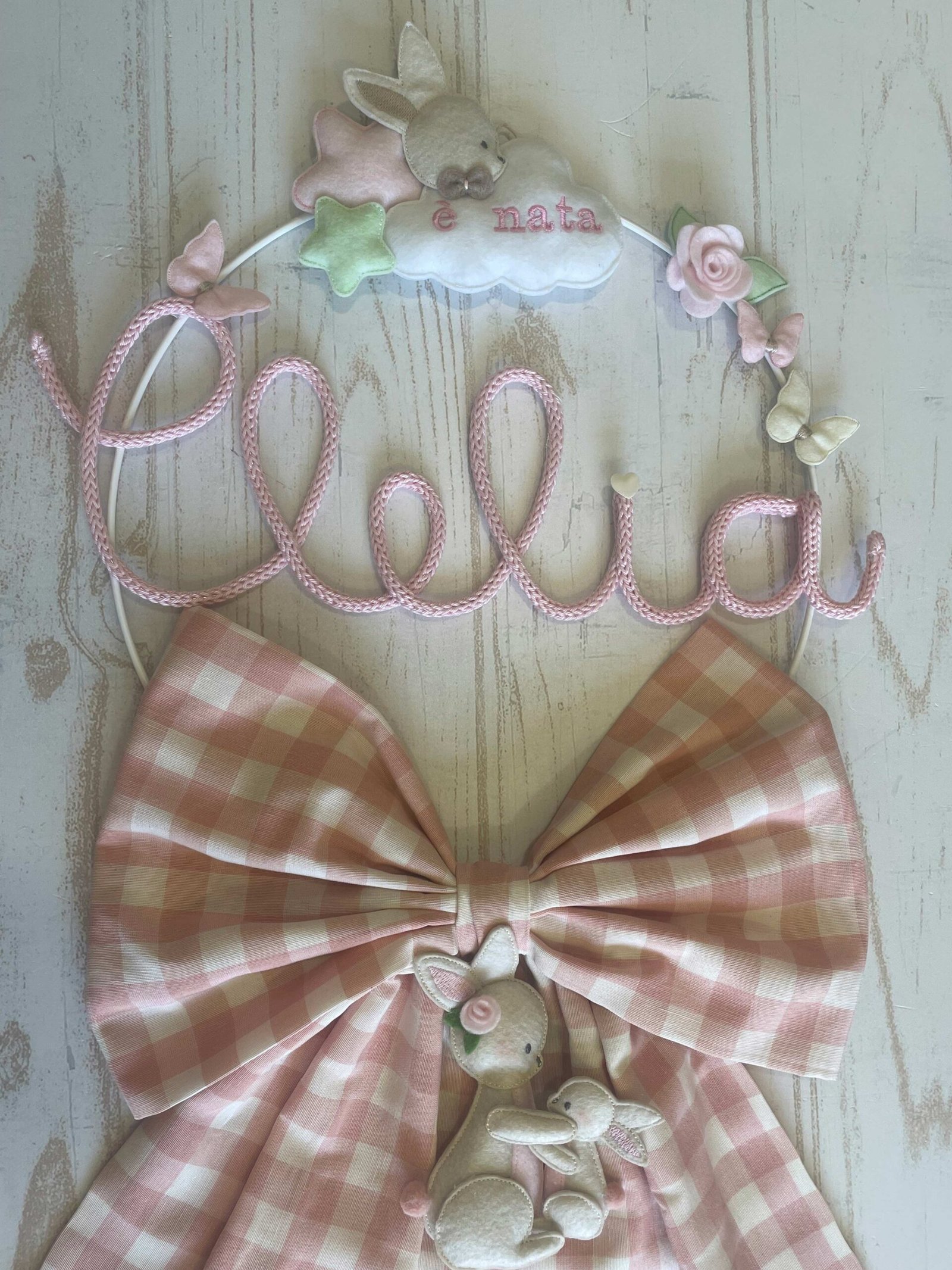Il fiocco, in tela di cotone a quadretti bianchi e rosa, è decorato con un cerchio in metallo bianco arricchito da fiori, farfalle, un piccolo papà coniglio e una nuvoletta con la scritta ricamata “è nata”, tutti in pannolenci.