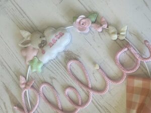Al centro spicca il nome della bimba in tricotin rosa, personalizzabile.