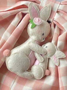 Completano la composizione una mamma coniglio con la sua piccola coniglietta, realizzate in pannolenci con dolcezza e maestria.