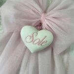 Il fiocco, in raffinato tulle rosa (con o senza glitter), è impreziosito da un cuore in pannolenci sul quale è ricamato il nome della bimba, creando un dettaglio unico e personalizzato.