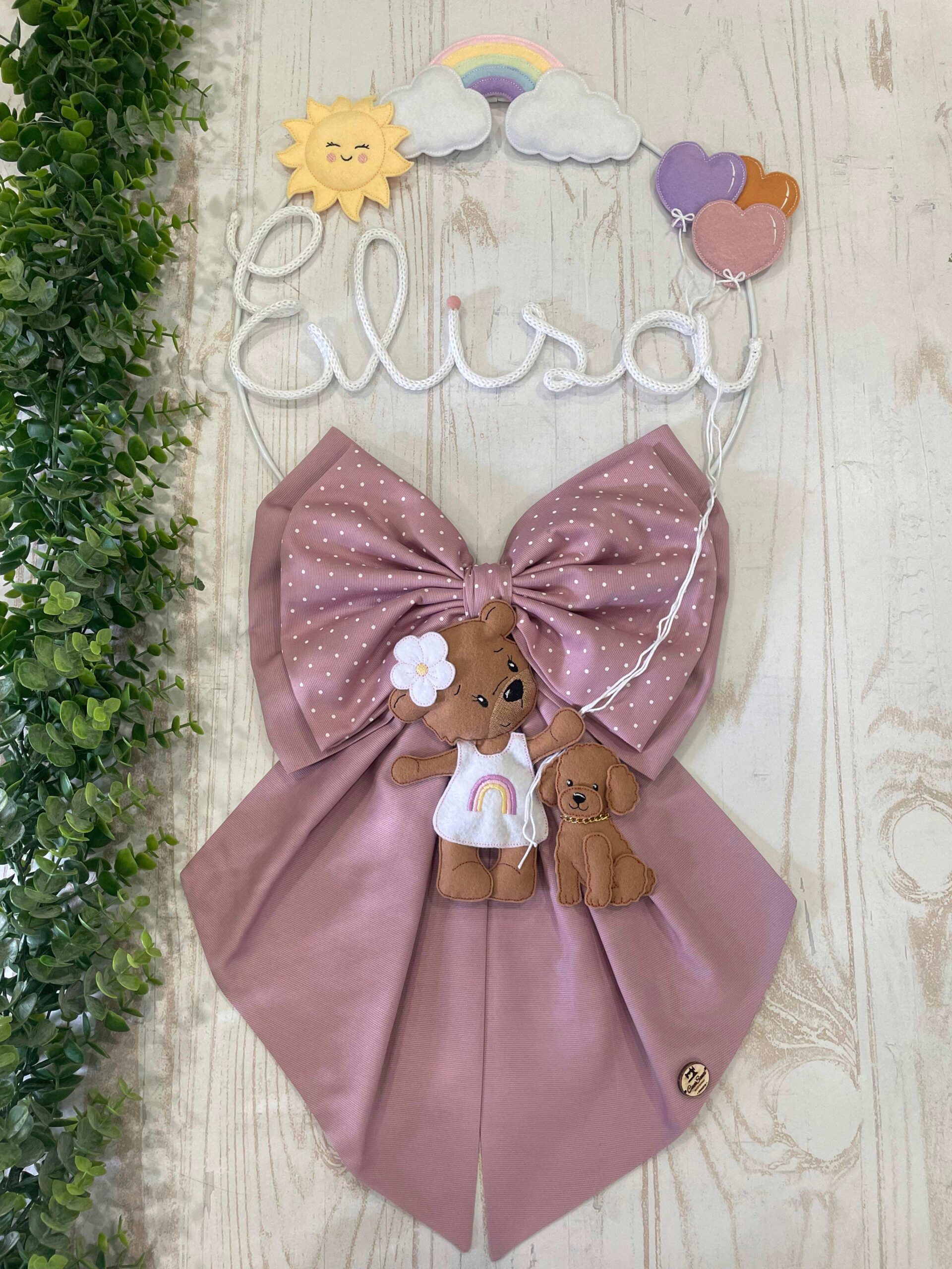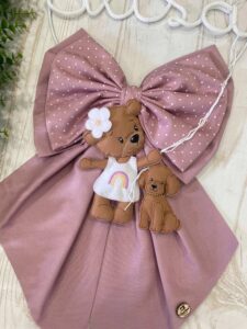 A completare la creazione, una tenera orsetta tridimensionale in pannolenci accompagnata da un dolce cagnolino, elementi che donano profondità e fascino al fiocco.