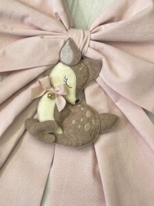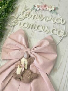 Dal fiocco pende un tenero cerbiatto tridimensionale in pannolenci, che completa l’insieme con dolcezza e originalità.