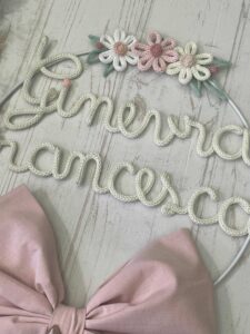 Al centro spiccano i due nomi della bimba in tricotin color panna, donando un tocco personale e luminoso.