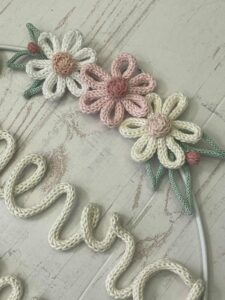 Un cerchio in metallo bianco, decorato con piccoli fiori realizzati in tricotin, incornicia la composizione con delicatezza ed eleganza.