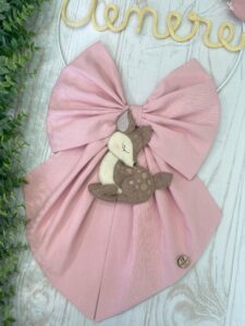 Il fiocco, in cotone rosa, è impreziosito da un cerchio in metallo bianco decorato con elementi in pannolenci, che dona un tocco fiabesco e raffinato.