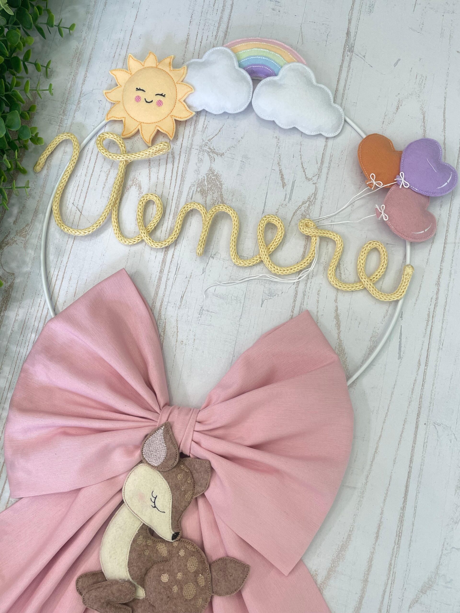 Al centro spicca il nome della bimba realizzato in tricotin giallo, mentre nella parte inferiore pende un tenero cerbiatto tridimensionale in pannolenci, simbolo di dolcezza e delicatezza.