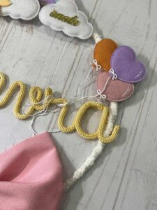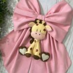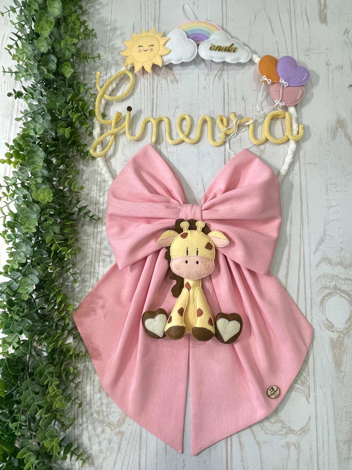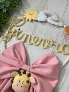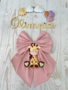 Al centro spicca il nome della bimba in tricotin (colore a scelta), mentre dal fiocco pende una tenerissima giraffa tridimensionale in pannolenci, realizzata con grande precisione artigianale.