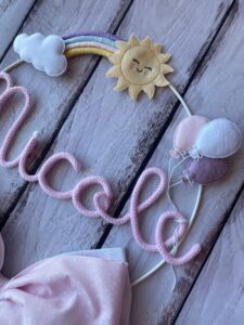Un cerchio in metallo bianco decorato con una nuvoletta, un arcobaleno, un sole e dei palloncini in pannolenci incornicia il fiocco, donando allegria e originalità. Al centro risalta il nome della bimba, realizzato in tricotin rosa.
