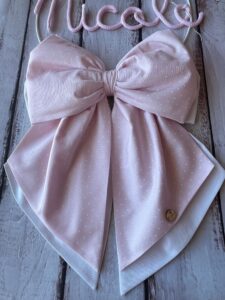 Il fiocco, in cotone rosa, è adagiato su un fiocco più grande bianco, creando armonia e delicatezza nella composizione.