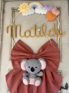 Dal fiocco pende un tenero koala tridimensionale in pannolenci, per un dettaglio dolce e originale, perfetto per celebrare l’arrivo della tua bimba.