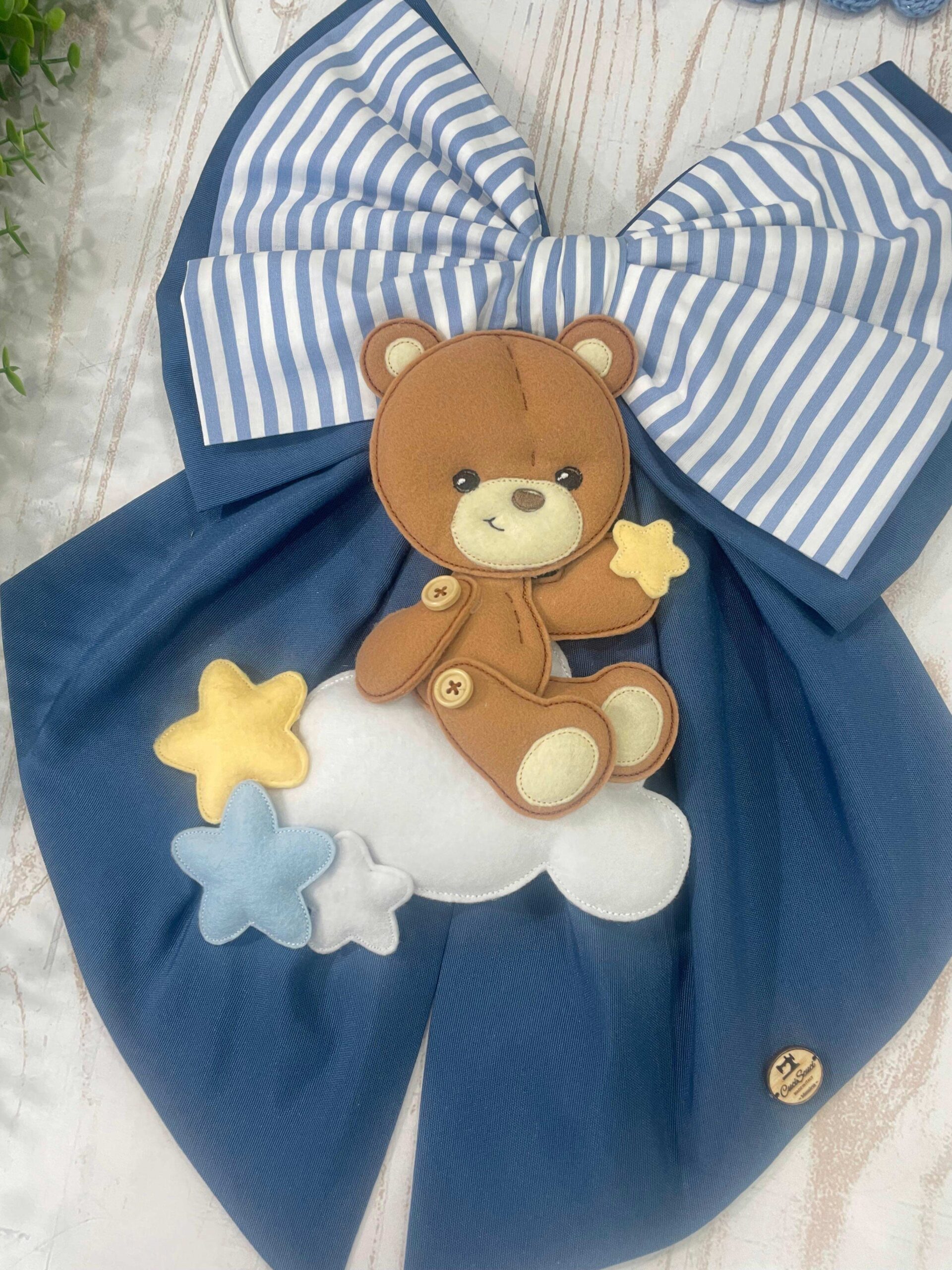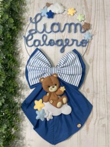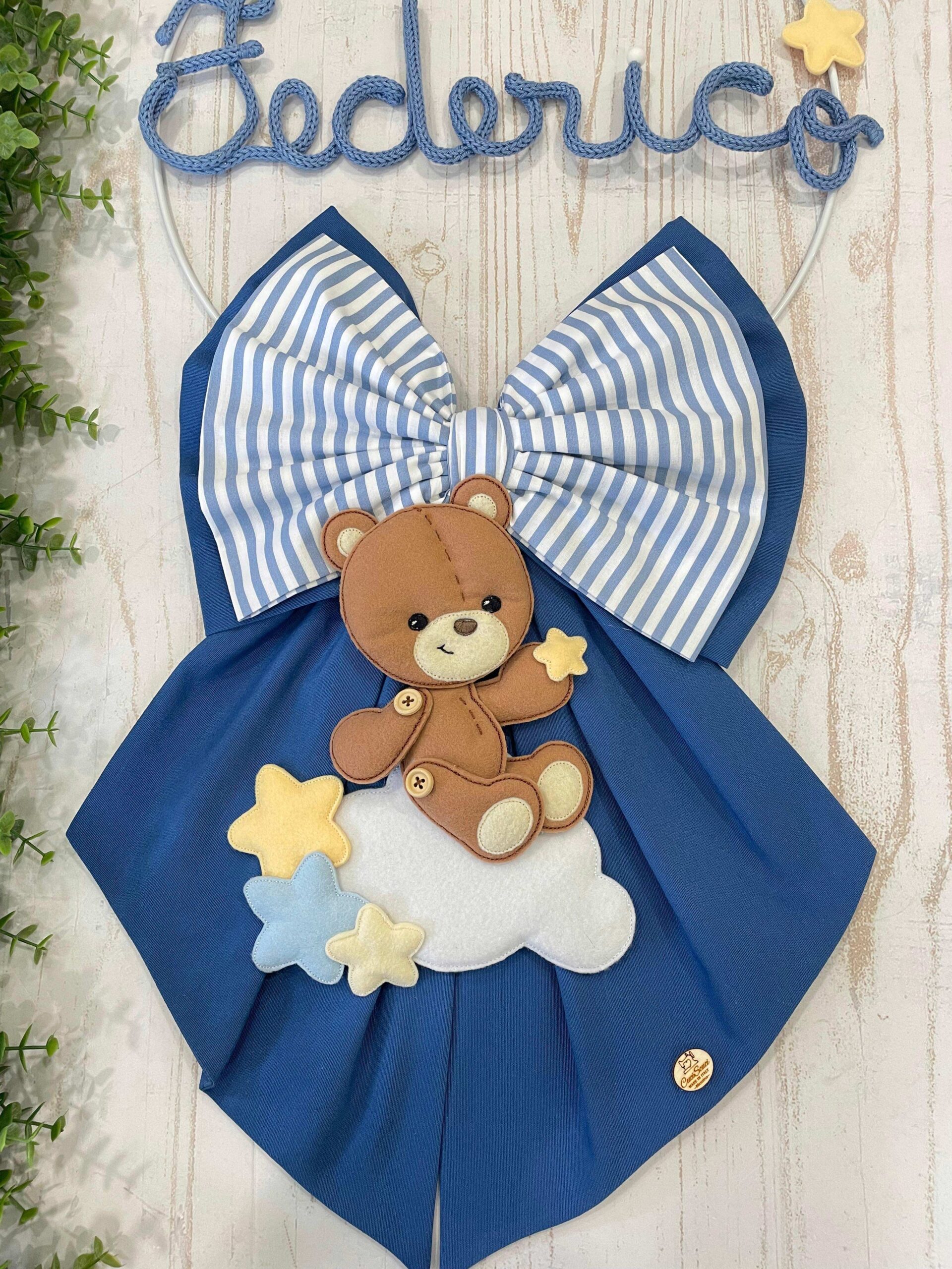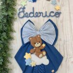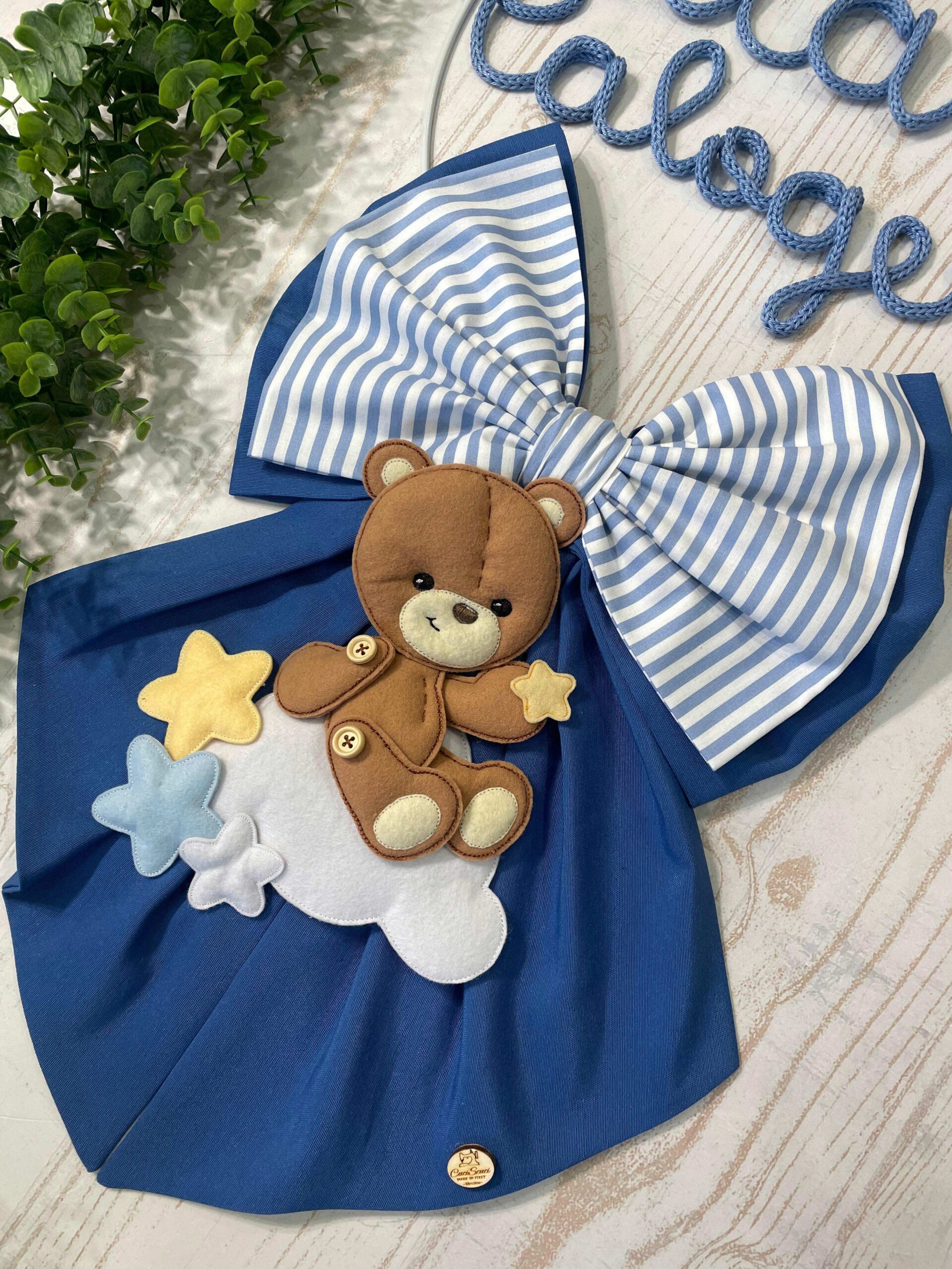 Un dolcissimo fiocco nascita realizzato interamente a mano dalla nostra sartoria, con amore e cura per ogni dettaglio.