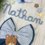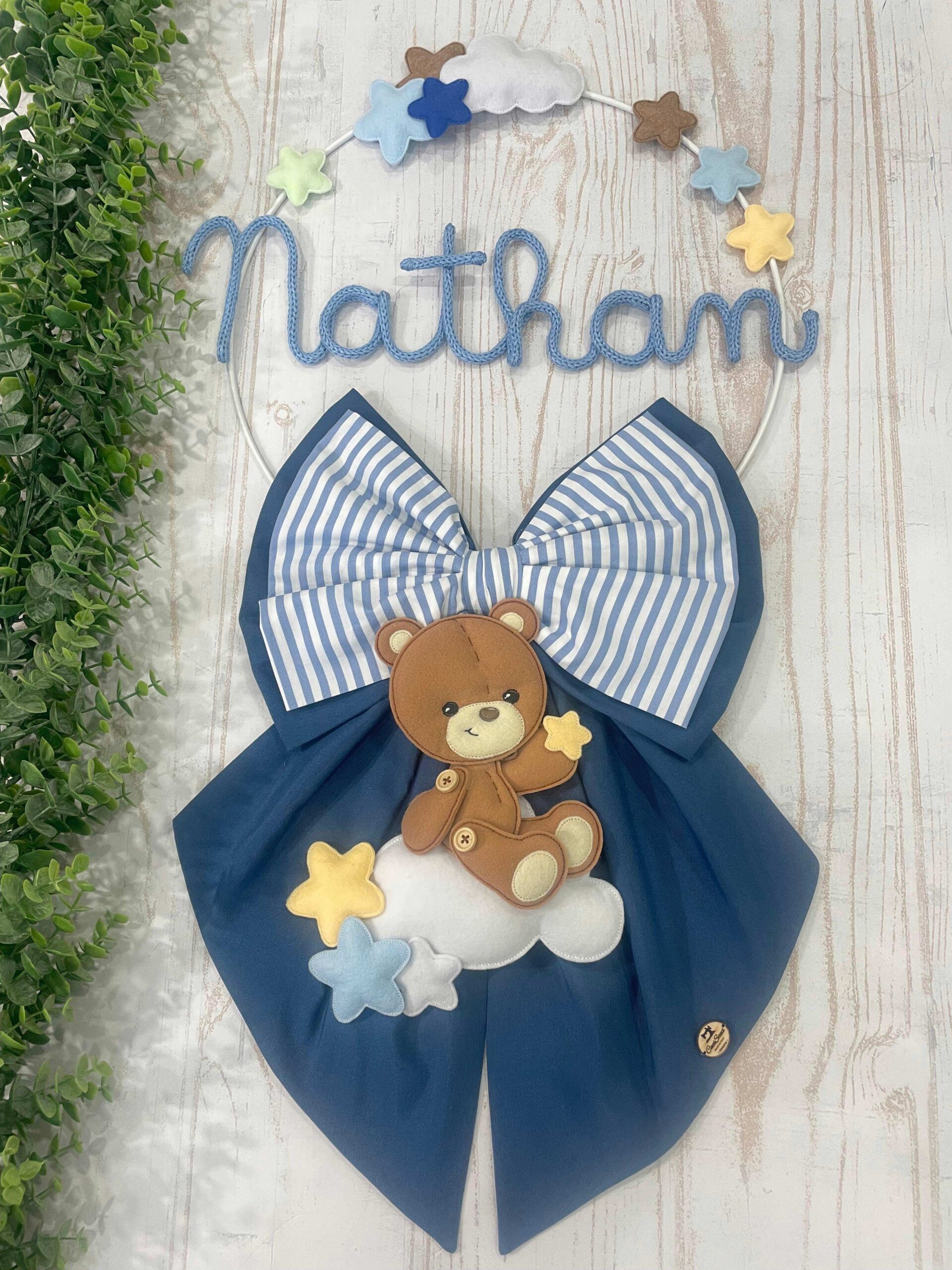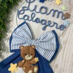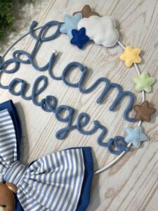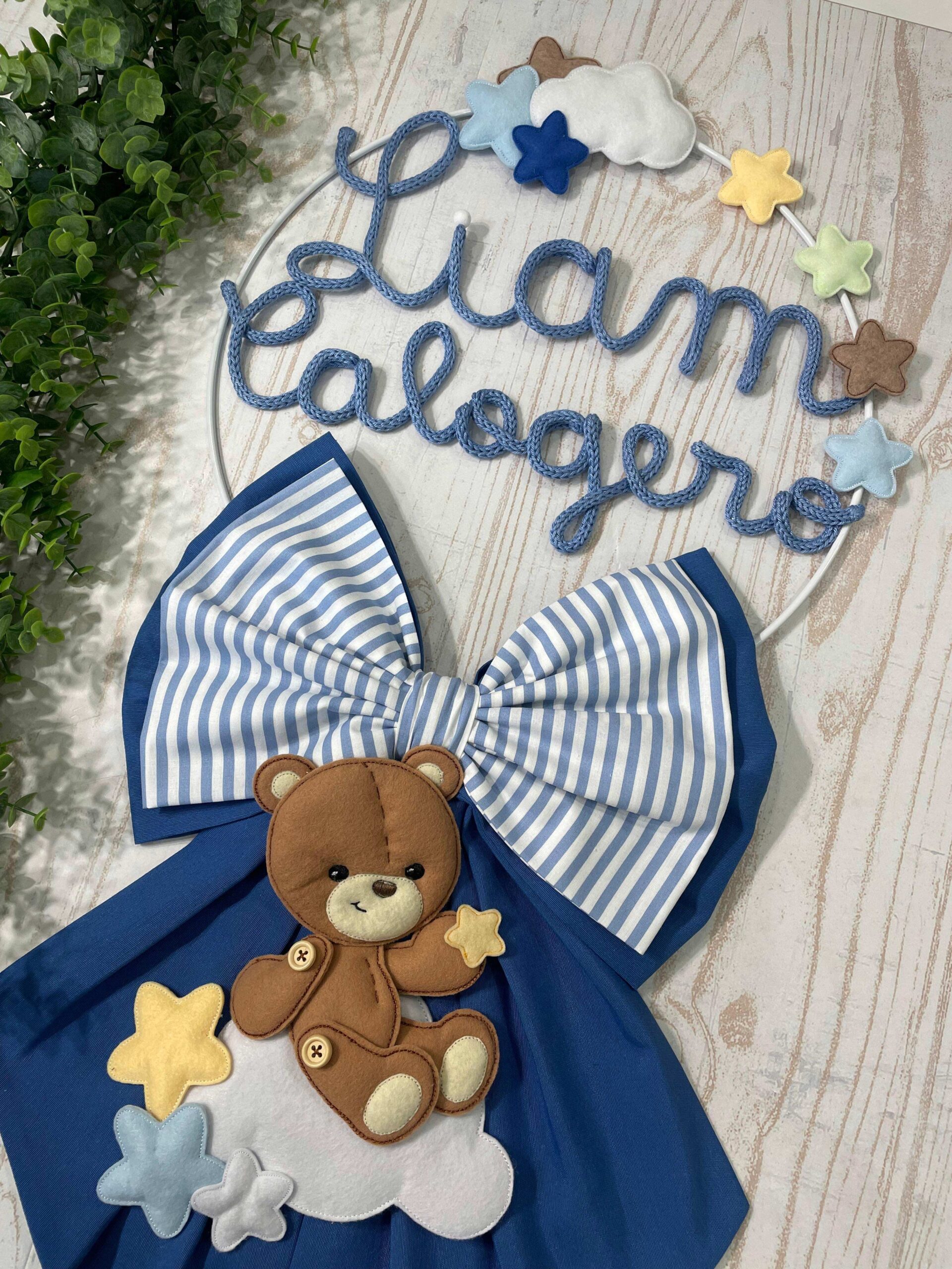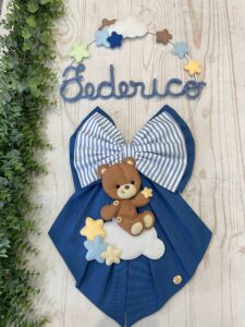 Un cerchio in metallo bianco decorato con nuvolette e stelline in pannolenci incornicia con delicatezza il nome del bimbo in tricotin azzurro, mentre nella parte inferiore un tenero orsetto tridimensionale seduto su una nuvoletta bianca completa con dolcezza la composizione.