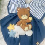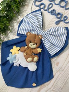 Il fiocco, in cotone azzurro, è impreziosito da un fiocco più piccolo a righe applicato su quello principale, creando un raffinato gioco di contrasti.