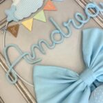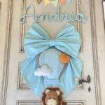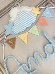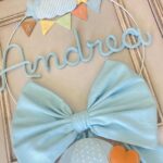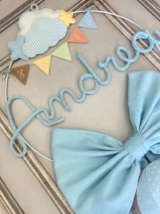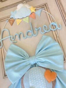 Il fiocco, in cotone azzurro, è impreziosito da un cerchio in metallo bianco decorato con nuvolette e stelline in pannolenci, che incorniciano con dolcezza il nome del bimbo in tricotin azzurro.