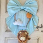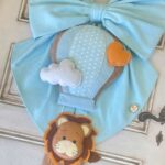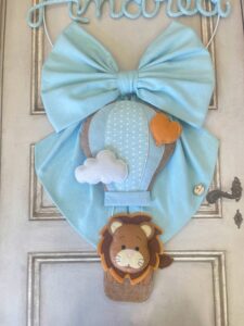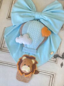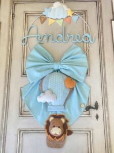 Sulla parte superiore del cerchio spiccano bandierine con ricamata la frase “è nato”, mentre nella parte inferiore pende un tenero leoncino tridimensionale in pannolenci a bordo di una mongolfiera: un dettaglio che rende il fiocco unico e scenografico.