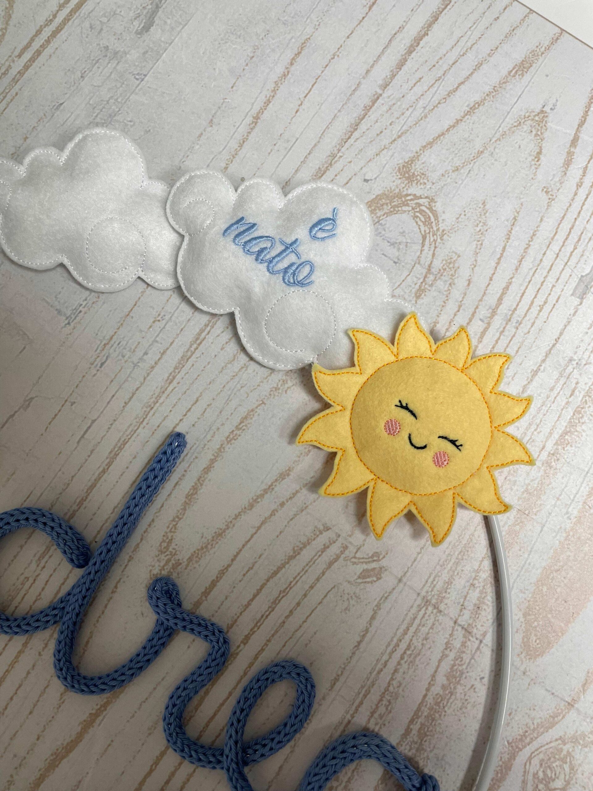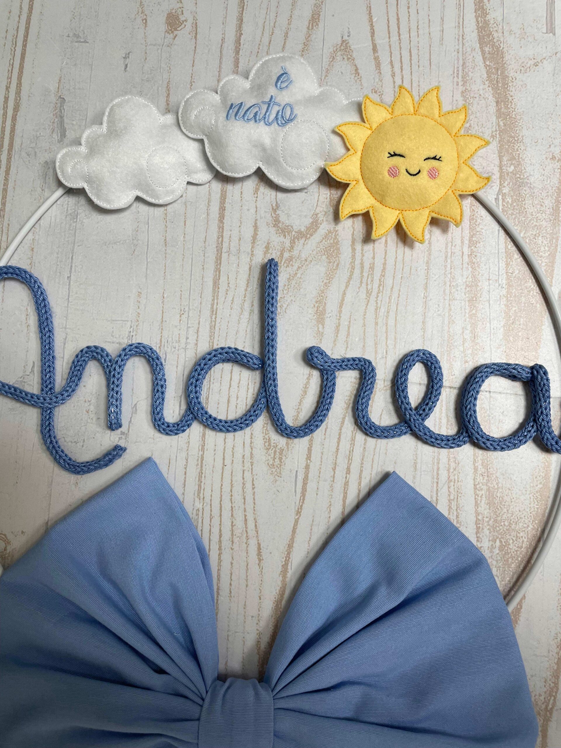 Il fiocco, in cotone azzurro, è incorniciato da un cerchio in metallo bianco arricchito da decorazioni in pannolenci.