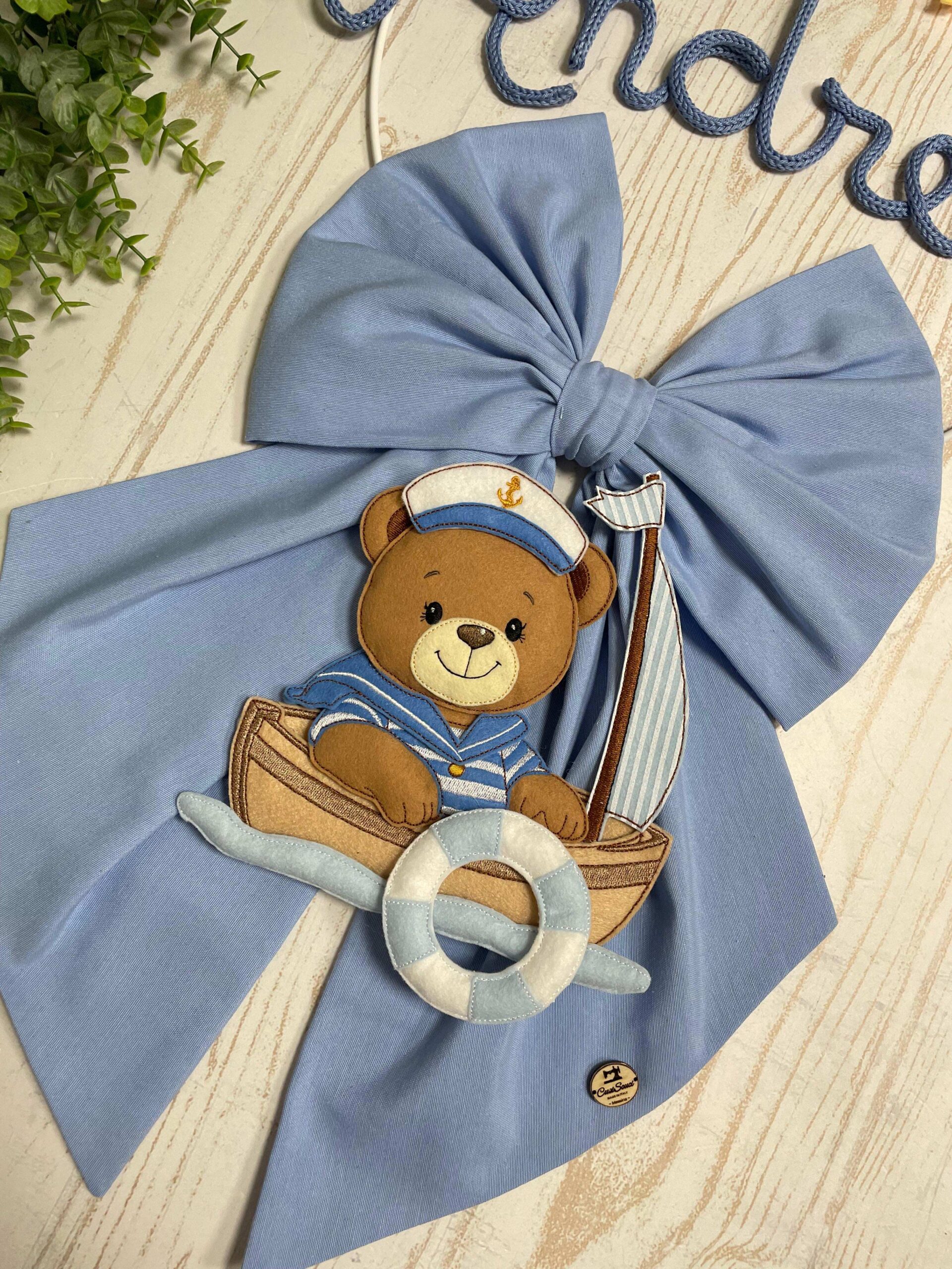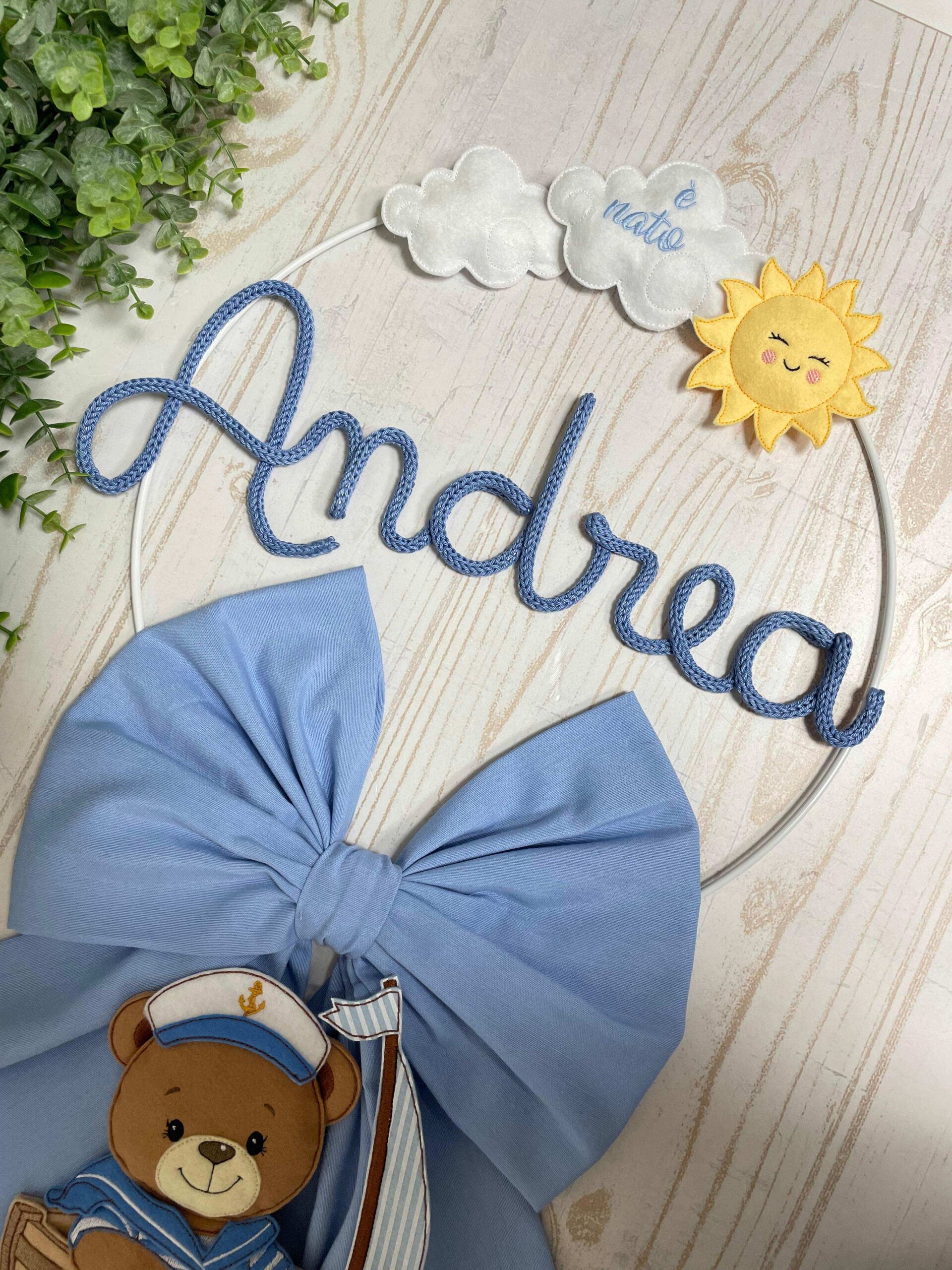 Al centro spicca il nome del bimbo in tricotin azzurro, mentre dal fiocco pende un tenero orsetto marinaio in pannolenci tridimensionale, a bordo di una piccola barchetta, per un dettaglio dolce e unico.