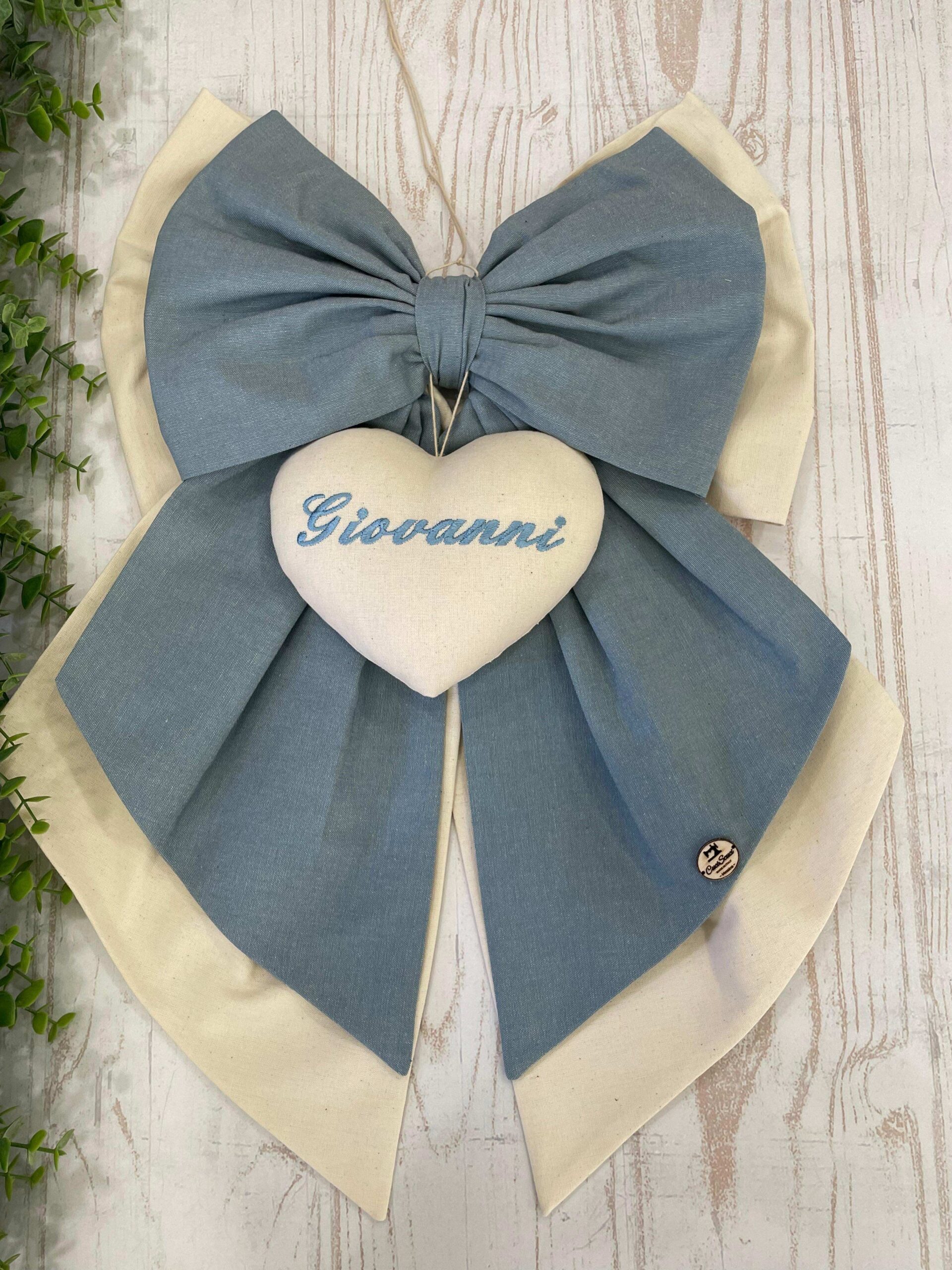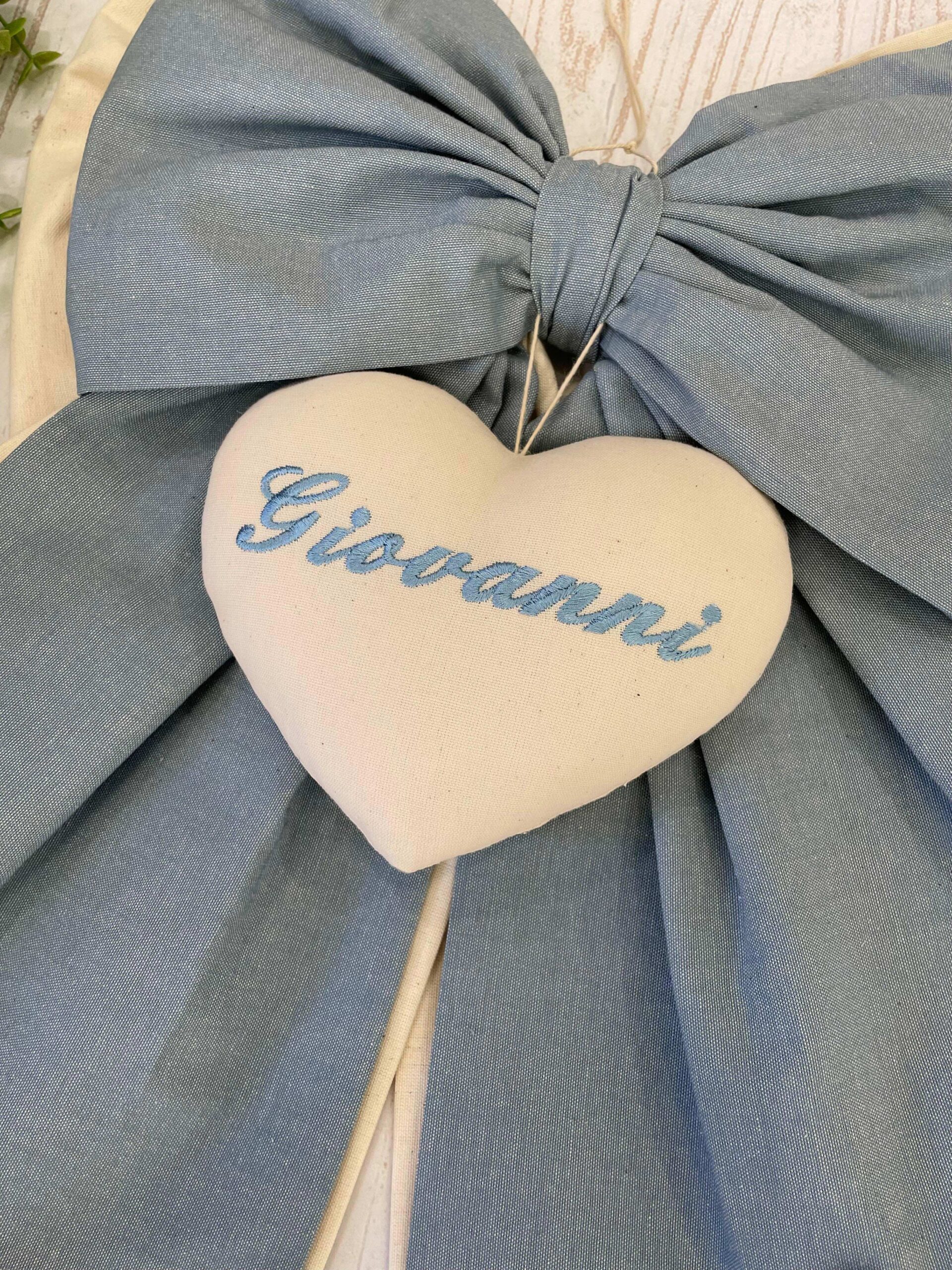 Fiocco Nascita Artigianale con Cuore Ricamato e Fiocco Azzurro