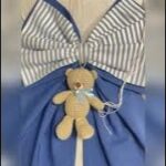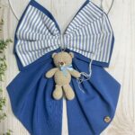 Il fiocco principale, in cotone blu, è arricchito da un secondo fiocco più piccolo a righe bianche e blu, che dona armonia e movimento alla composizione.
