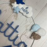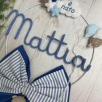 Un cerchio in metallo bianco decorato con stelline, palloncini e una dolce nuvoletta in pannolenci con la scritta “è nato” incornicia il nome del bimbo, realizzato in tricotin blu.