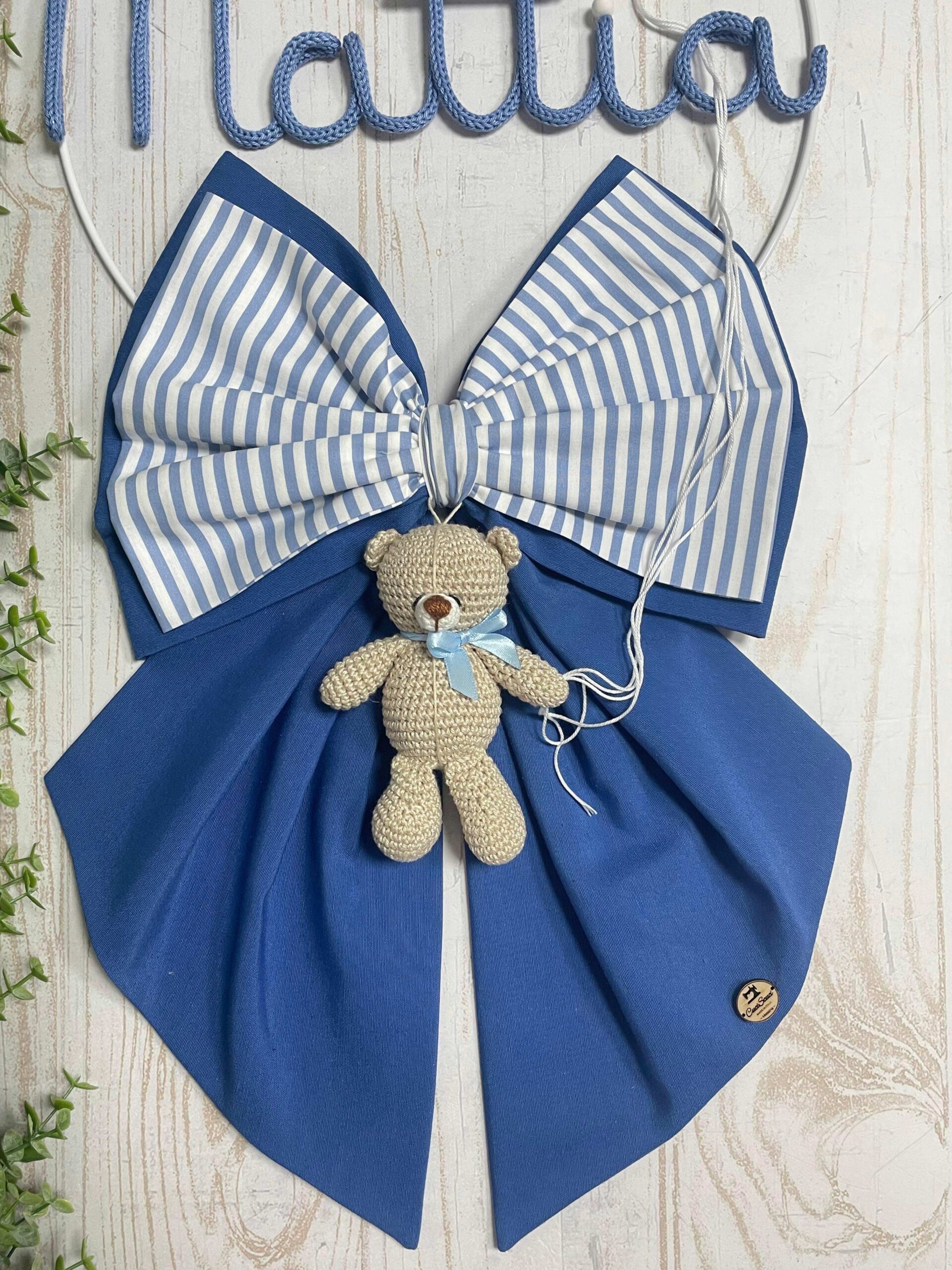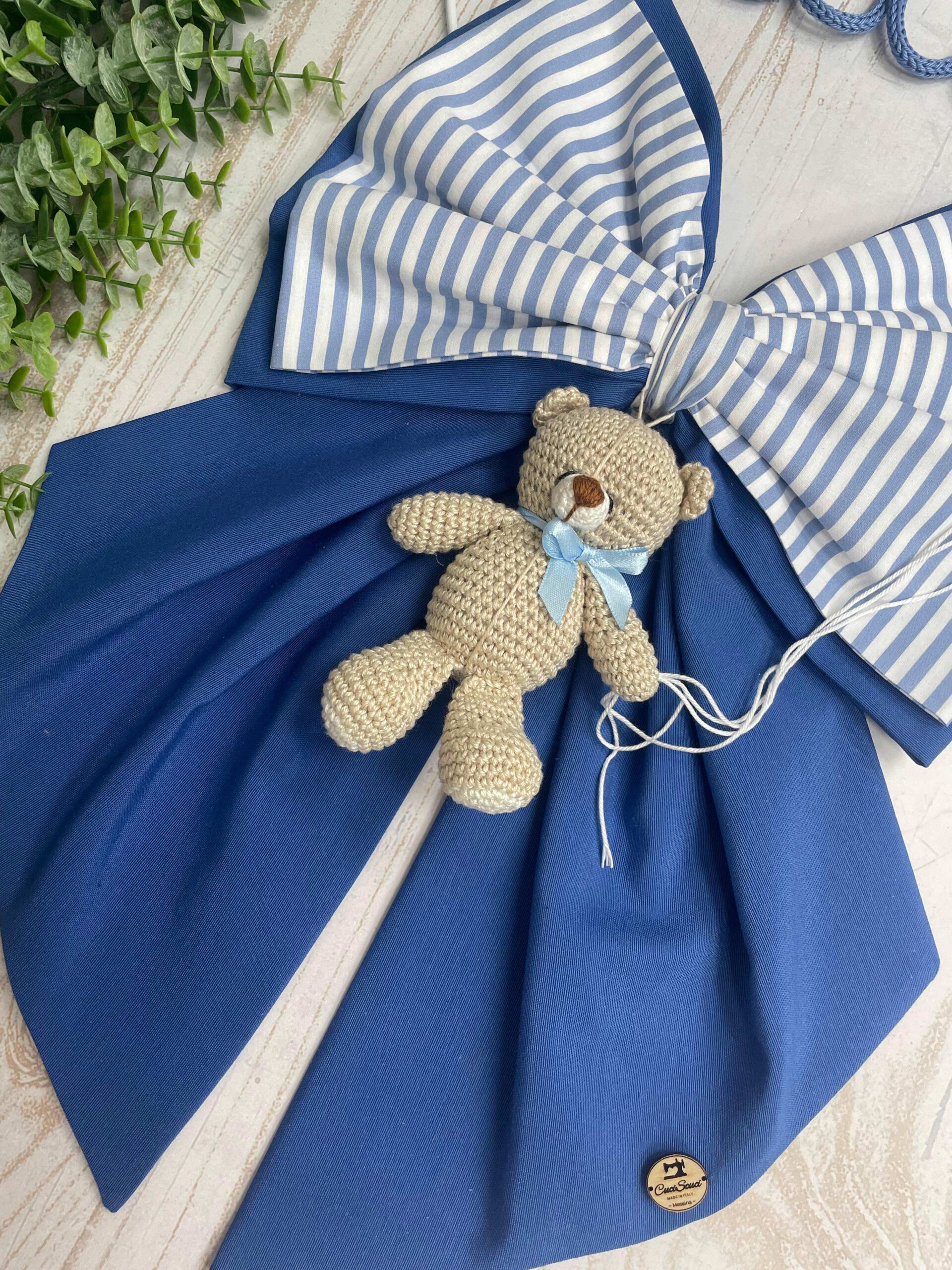 Il fiocco principale, in cotone blu, è arricchito da un secondo fiocco più piccolo a righe bianche e blu, che dona armonia e movimento alla composizione.